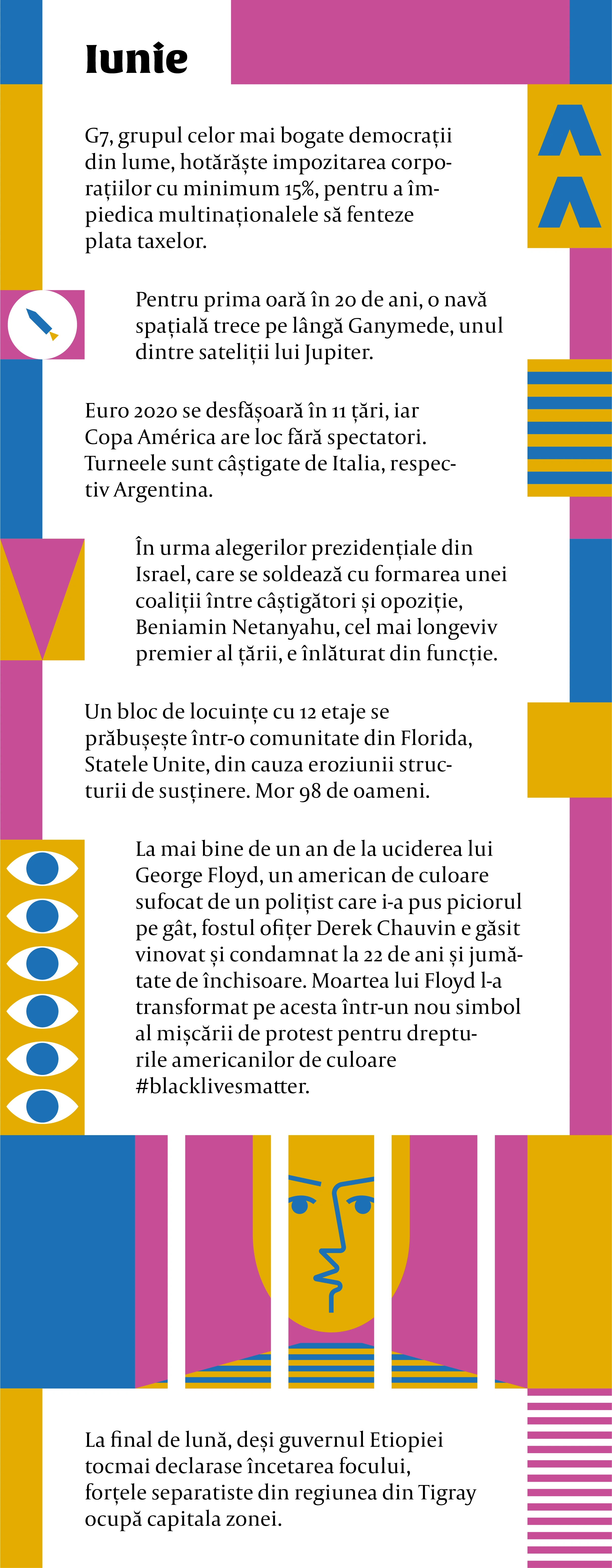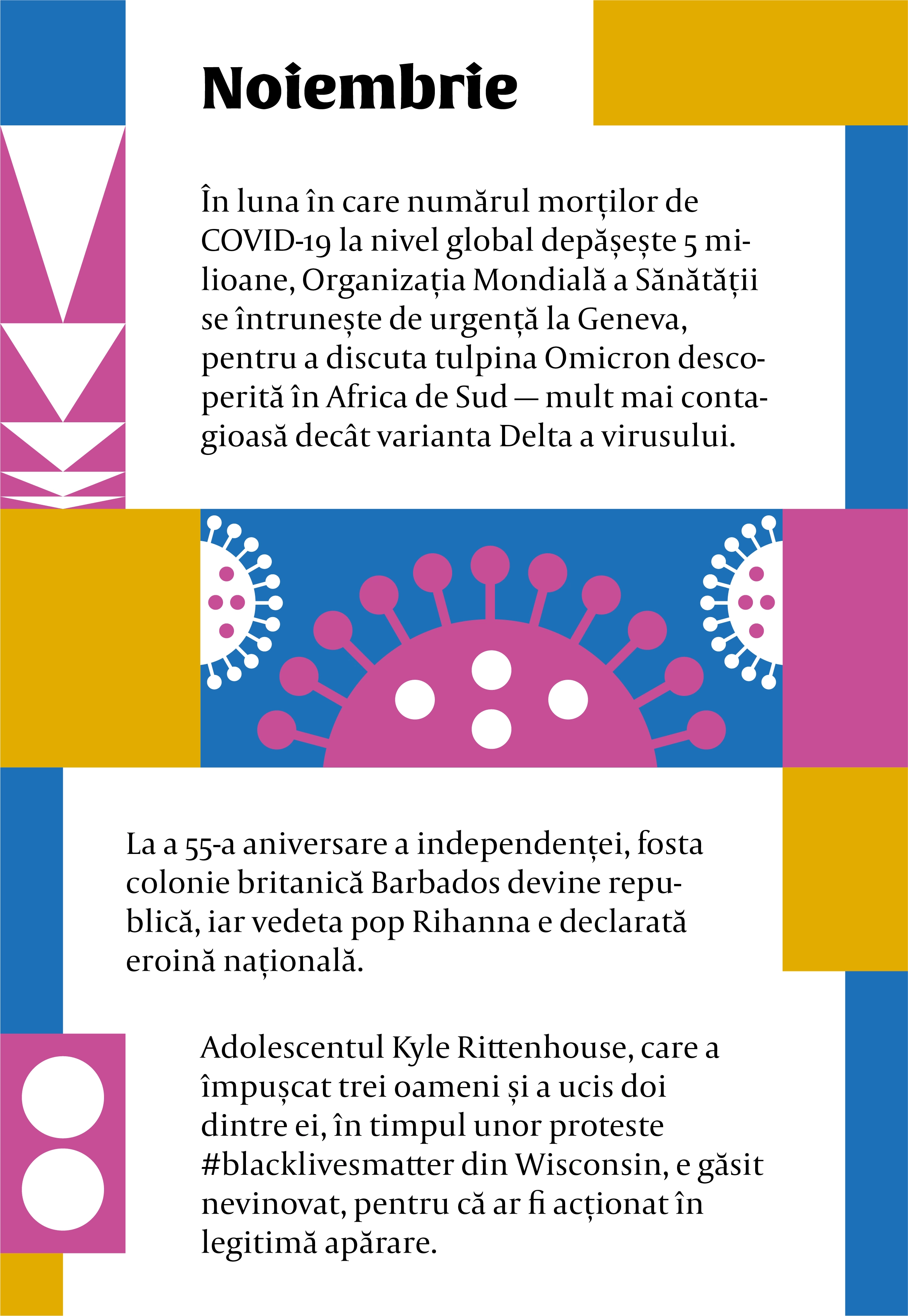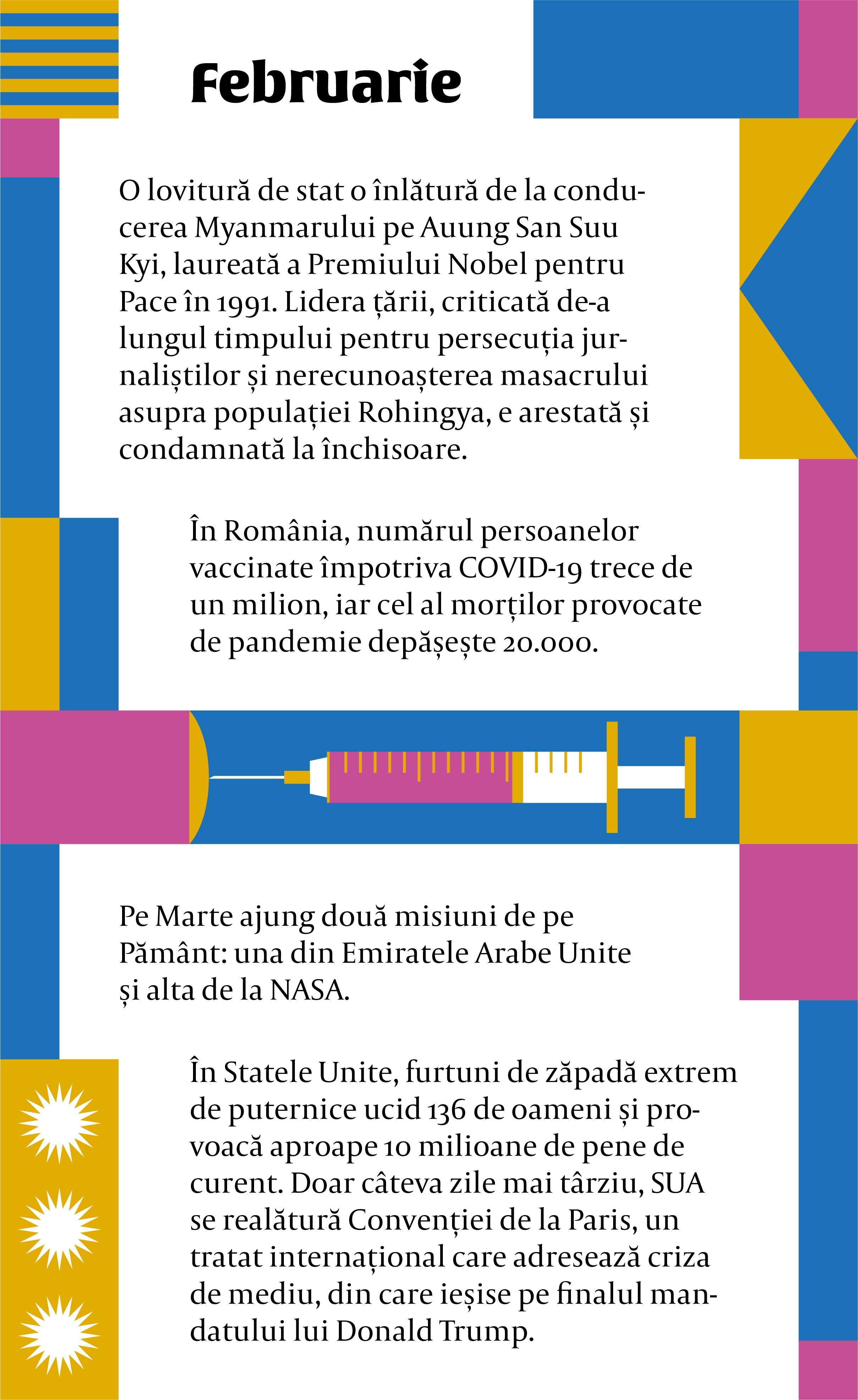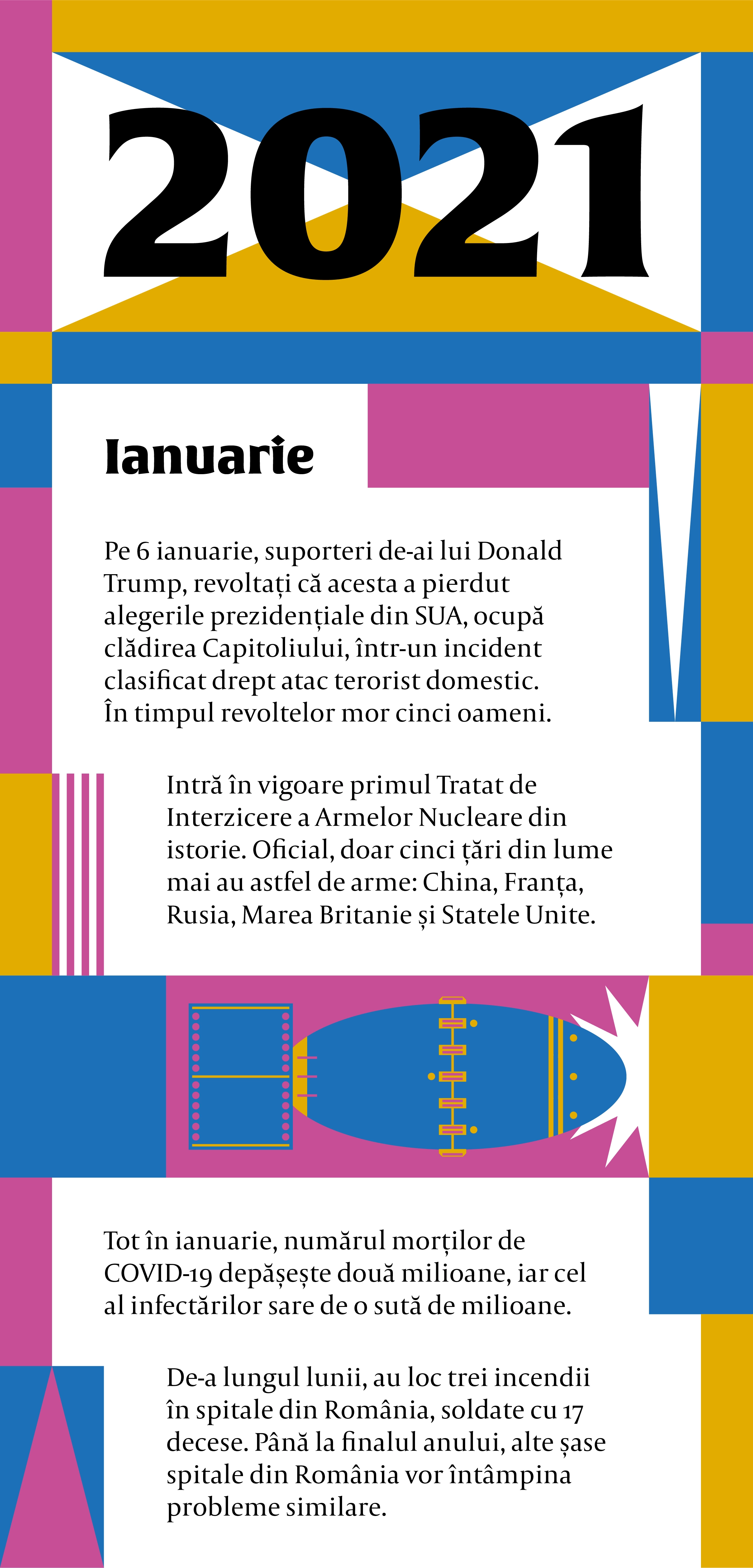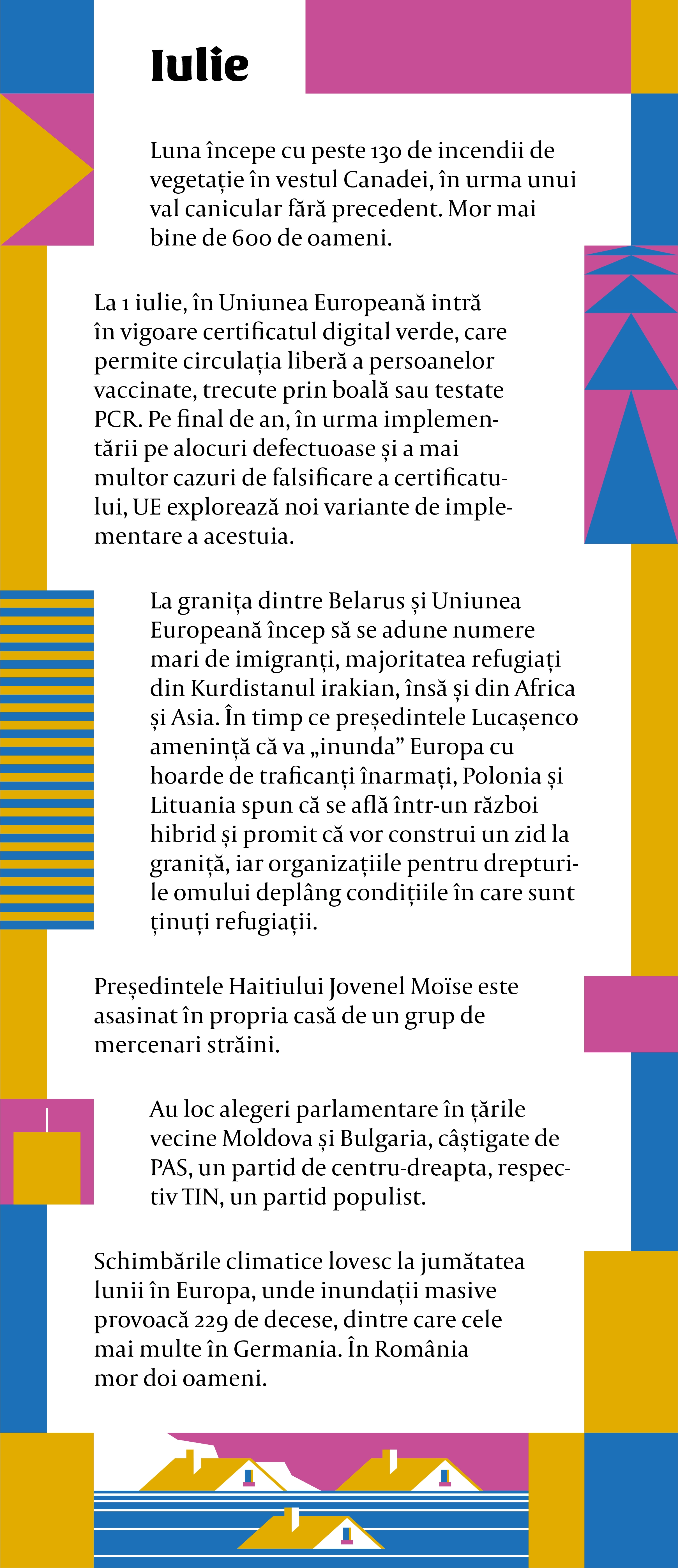 Pe tot cuprinsul globului au fost testate diverse scenarii de „redeschidere”, în anotimpul cald, însă sezonul rece a adus noi tulpini și restricții. Scena politică a văzut transformări masive, din Statele Unite până-n Moldova. Războiul și-a ițit capul - în Afganistan, în Israel și, momentan insinuant, la granițele Rusiei. Economia n-a dus-o nici ea bine, iar experții din lumea întreagă par să-și țină răsuflarea în așteptarea unei crize asupra căreia nu există consens. Întrebarea nu pare să fie „va fi rău?”, ci „cât de rău va fi?”