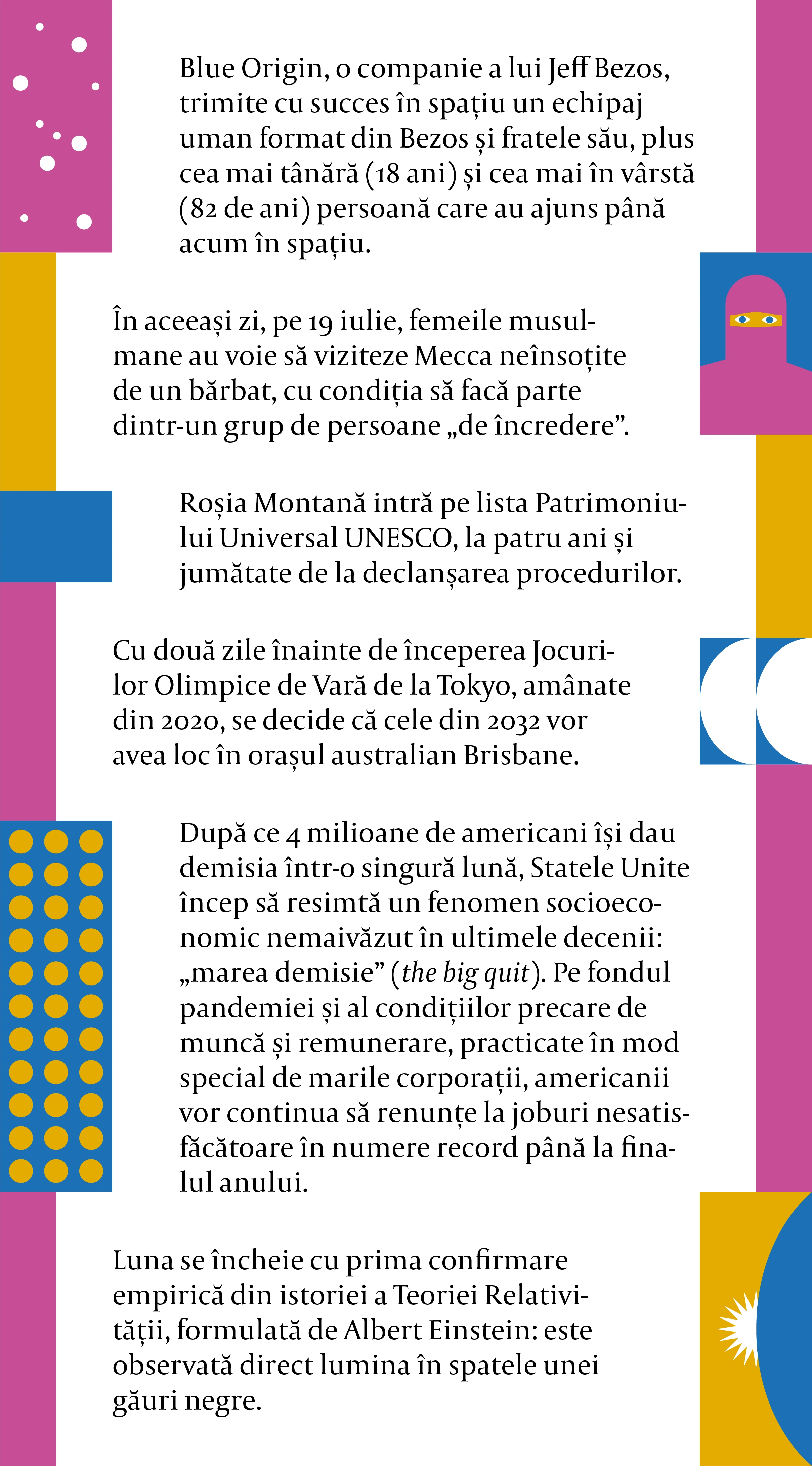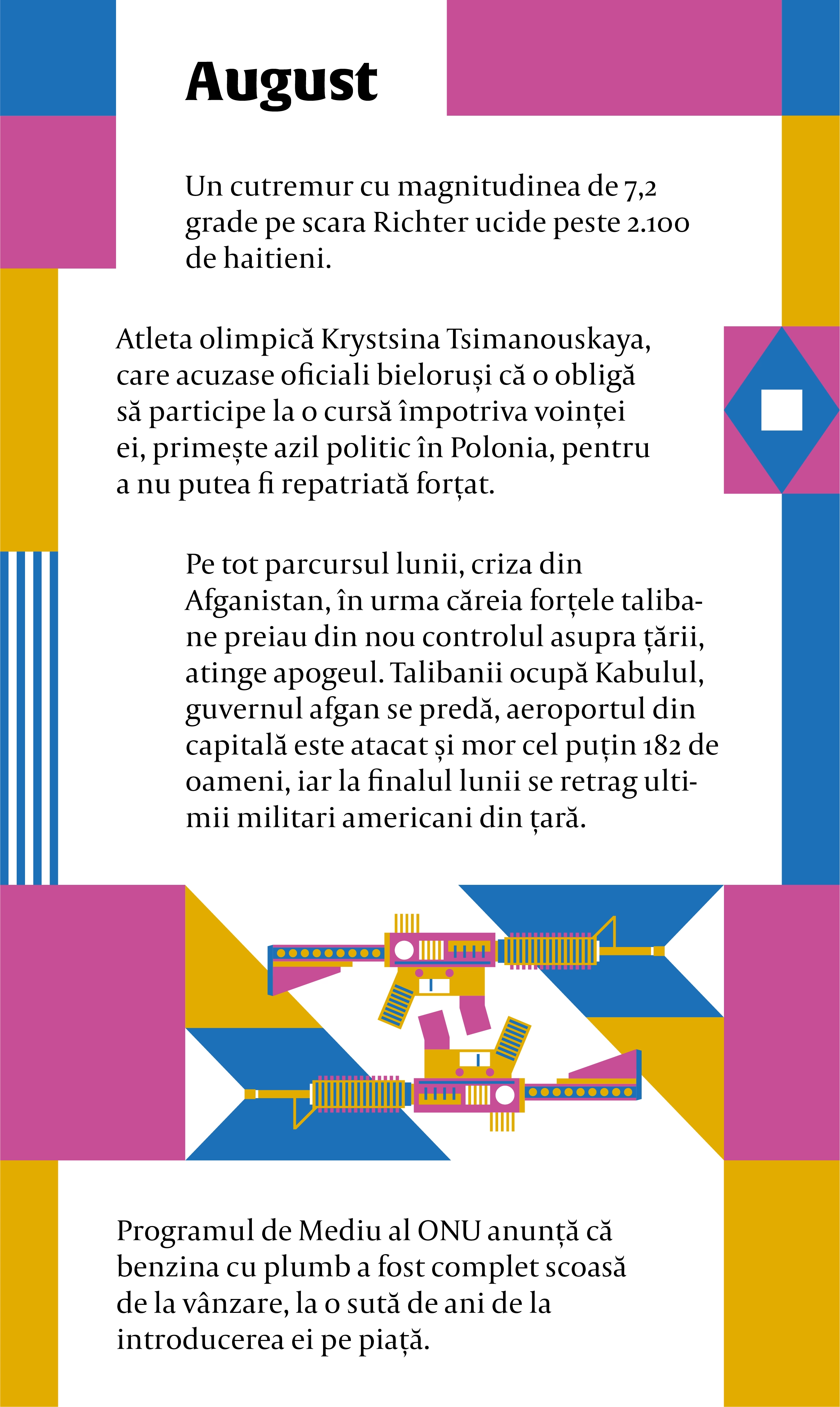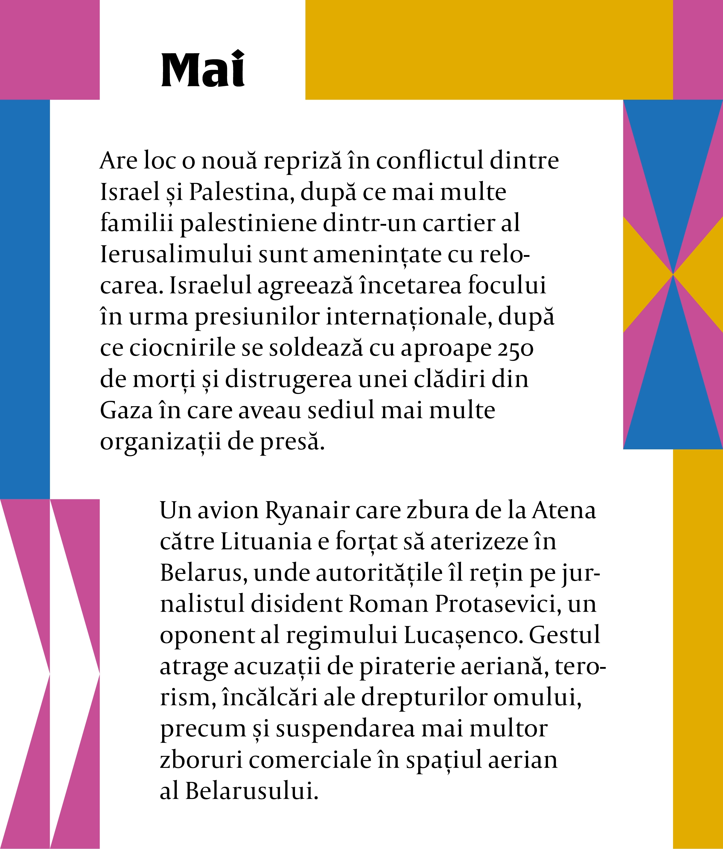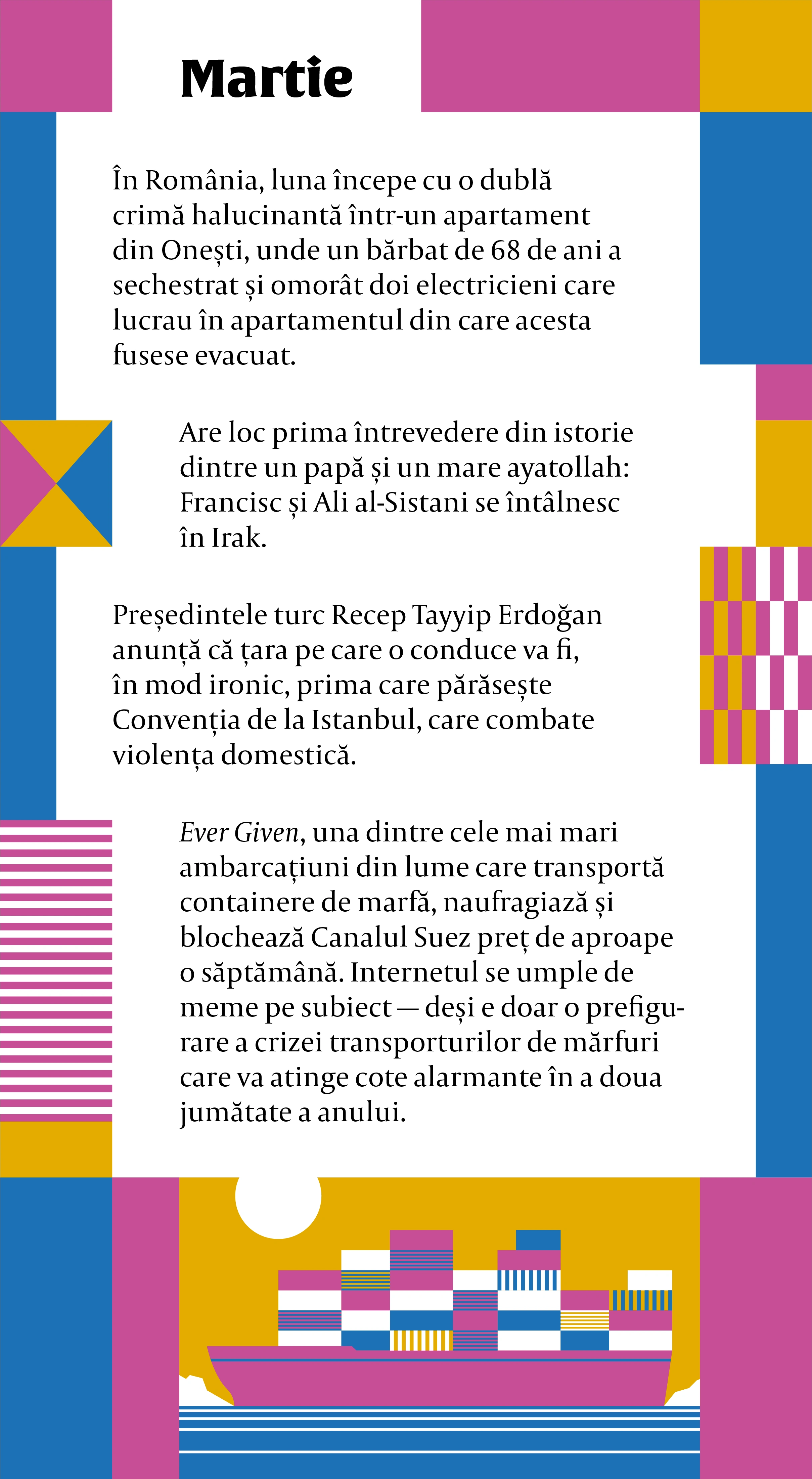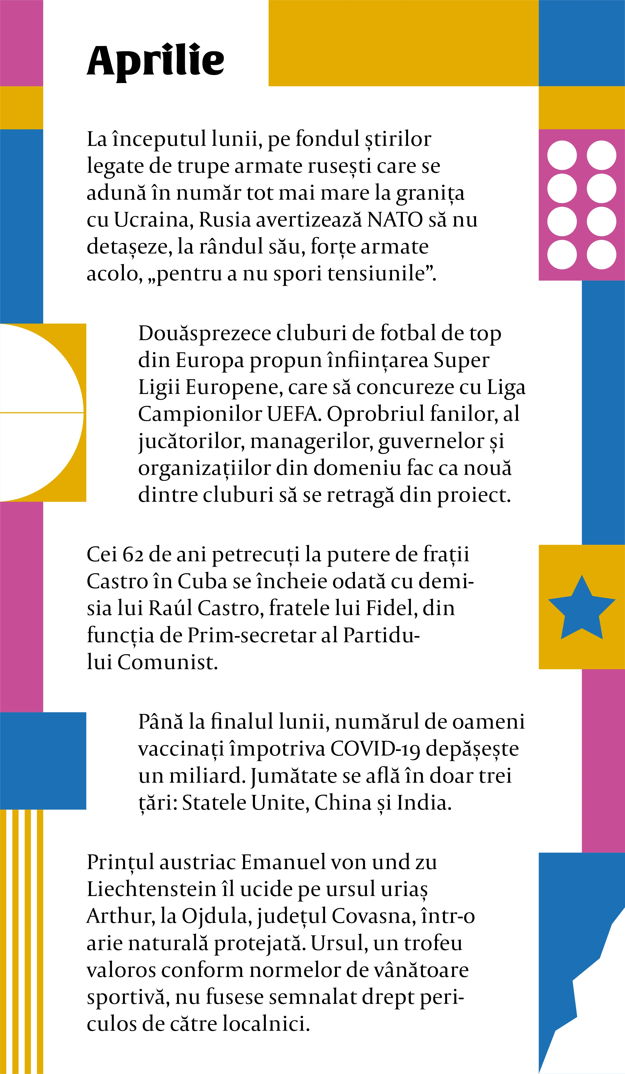 Pe tot cuprinsul globului au fost testate diverse scenarii de „redeschidere”, în anotimpul cald, însă sezonul rece a adus noi tulpini și restricții. Scena politică a văzut transformări masive, din Statele Unite până-n Moldova. Războiul și-a ițit capul - în Afganistan, în Israel și, momentan insinuant, la granițele Rusiei. Economia n-a dus-o nici ea bine, iar experții din lumea întreagă par să-și țină răsuflarea în așteptarea unei crize asupra căreia nu există consens. Întrebarea nu pare să fie „va fi rău?”, ci „cât de rău va fi?”