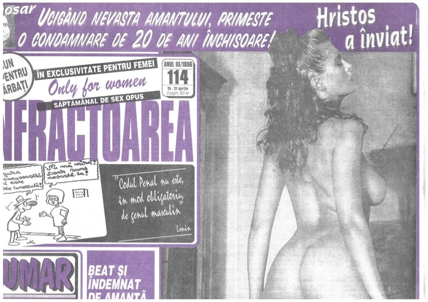 Răsfoiesc numărul 31, din septembrie 1994. Numele „Infractoarea” e flancat de subtitlul „În exclusivitate pentru femei/ Only for women, Săptămânal de sex opus” și de un motto: „Codul Penal nu este în mod obligatoriu de genul masculin”, atribuit lui Lenin. O femeie în lenjerie intimă, cu spatele arcuit, acoperă aproape trei sferturi din pagina A3 de ziar. Poartă colier alb, mânuși, ciorapi cu portjartier, chiloți, toate negre, și are sânii complet la vedere. Se uită în ochii cititorului și are buzele întredeschise – clasica expresie din revistele pornografice. E însoțită de trei mici caricaturi, iar gluma din cea mai explicită e că un bărbat face sex cu mai multe păpuși gonflabile, sub pretextul că ar vrea să cumpere una. Coloana de lângă femeia dezbracată titrează: „Inspirat de visul erotic, și-a violat soacra”, „Miloasă ajută o bătrână… să treacă pe lumea cealaltă”. De lângă femeia seducătoare, tot pe prima pagină, te fixează capul desprins de corpul unui om pe niște șine de tren. Are ochii întredeschiși și gura larg deschisă. Chiar dacă fotografia e alb-negru, e imposibil să nu vezi sângele. Între el și tocurile femeii, o încurajare scrisă cu litere mari, mov: „Zâmbește! Mâine va fi mai rău.”