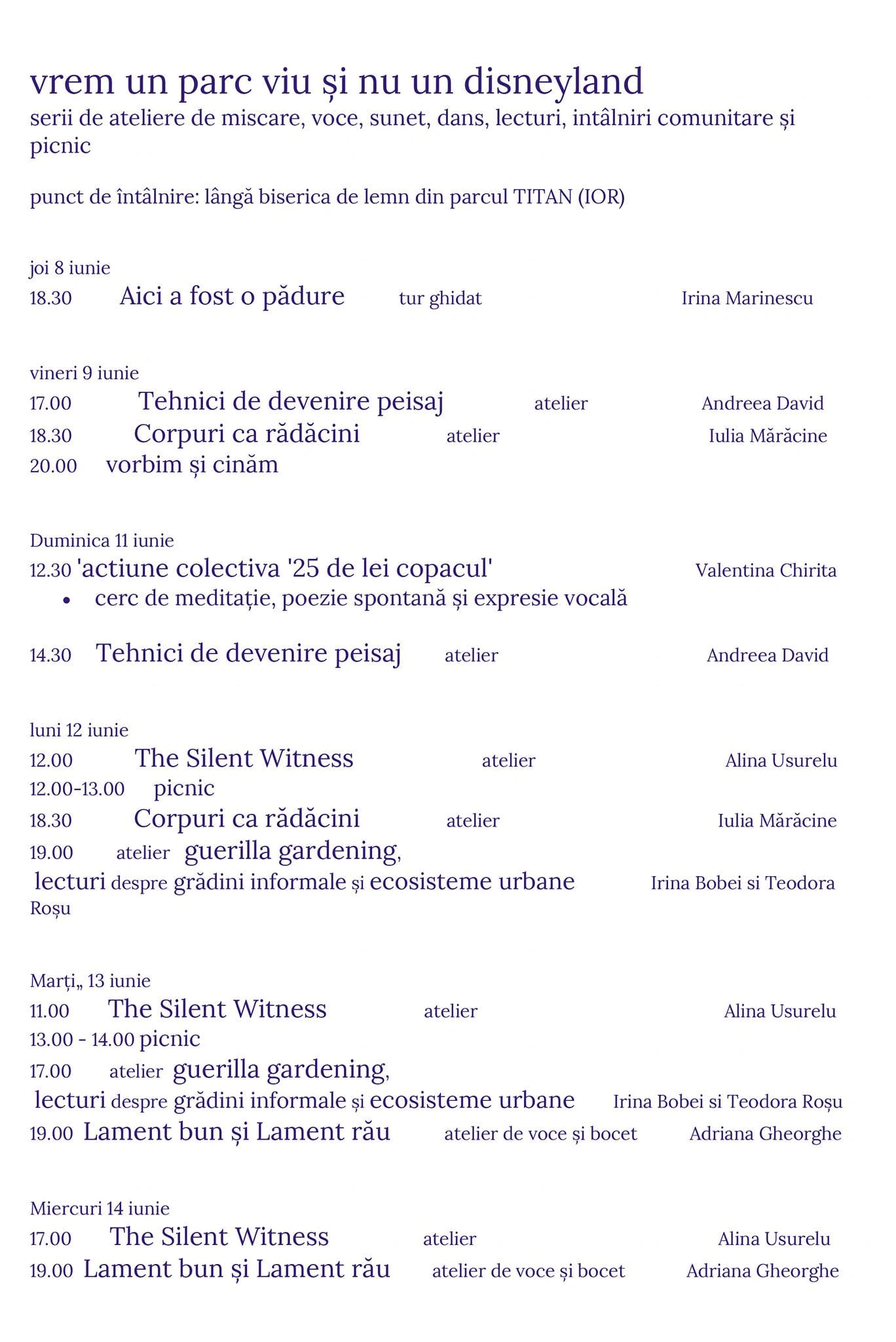 În acest sens, prin moduri de încorporare a spațiului organic și temporar, aș vrea să vă propun să ne adunăm în luna iunie, în fiecare seară, în acea zonă problematică a parcului, să propunem practici, ateliere, intervenții artistice, pornind de la relația dintre corporalitățile a căror prezență, existență și relație de coabitare e vitală. Vom aborda un demers slab, anti-putere, un mod de locuire efemeră într-un non-spațiu.