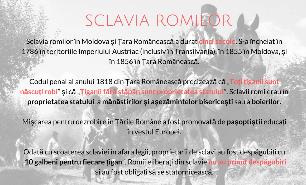 „Chiar pe uliţele oraşului Iaşi, în tinereţele mele am văzut fiinţe omeneşti purtând lanţuri în mâini sau la picioare, ba unii chiar coarne de fier aninate de frunte şi legate prin coloane împrejurul gâtului. Bătăi crude, osândiri la foame şi la fum, închidere în închisori particulare, aruncaţi goi în zăpadă sau în râuri îngheţate, iată soarta nenorociţilor ţigani! Apoi dispreţul pentru sfinţenia şi legăturile de familie. Femeia luată de la bărbat, fata răpită de la părinţi, copiii rupţi de la sânul născătorilor lor şi răzleţiţi şi despărţiţi unii de alţii, şi vânduţi ca vitele la deosebiţi cumpărători, în cele patru colţuri ale României.” (Mihail Kogălniceanu, într-un discurs susținut în 1891, în cadrul Academiei Române)