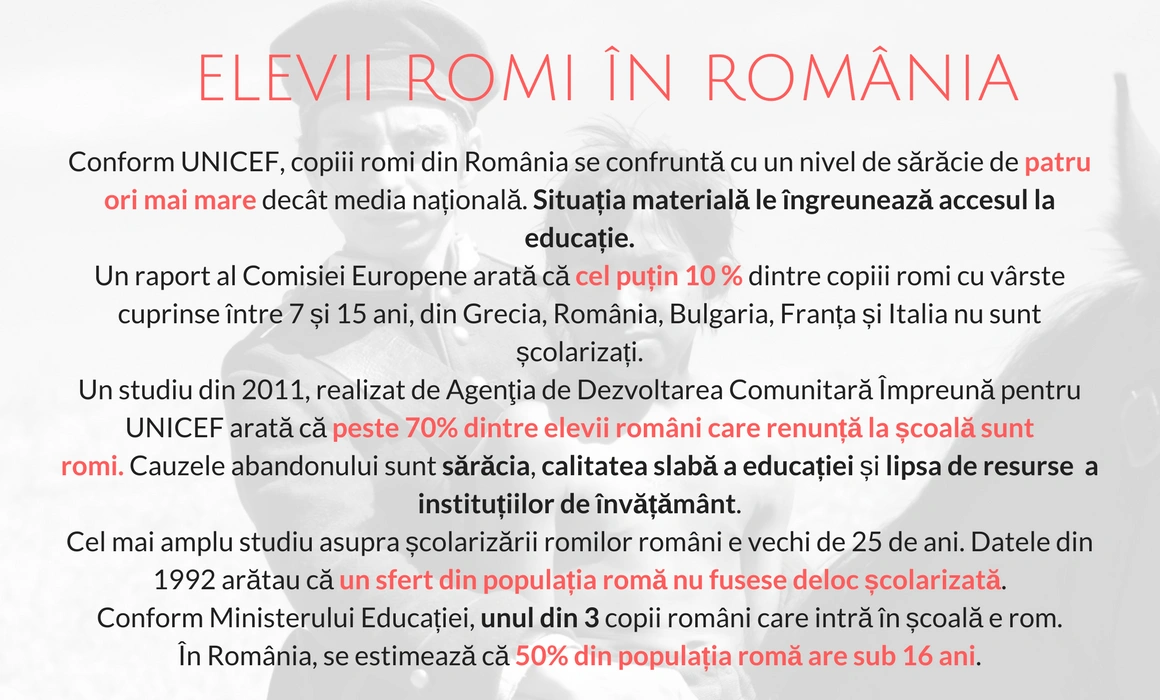 Rasismul anti-rom, latent în perioada comunistă, a devenit explicit după Revoluție. Una dintre formele de rasism, segregarea rezidențială și existența școlilor segregate etnic, a fost rezolvată repede și prost. Înainte de ‘89, statul construise școli în satele izolate, de romi. Odată cu desființarea sistemului de repartiție a profesorilor după Revoluție, în localitățile respective nu mai ajungeau decât profesori slab pregătiți – cei buni alegeau să evite comunitățile sărace și greu accesibile. Școlile romilor, rămase fără profesori, cu puțini elevi și adeseori aflate într-o stare avansată de degradare fizică, au fost desființate. Fără evaluări, fără reparații, fără strategii de aducere a unor profesori mai buni. Copiii romi au fost trimiși la școlile majoritarilor. Ca și în cazul desegregării școlilor din Statele Unite, după cazul Brown v. Board of Education, tot etnicii minoritari au avut de suferit, pentru că asupra lor a căzut povara „integrării”.