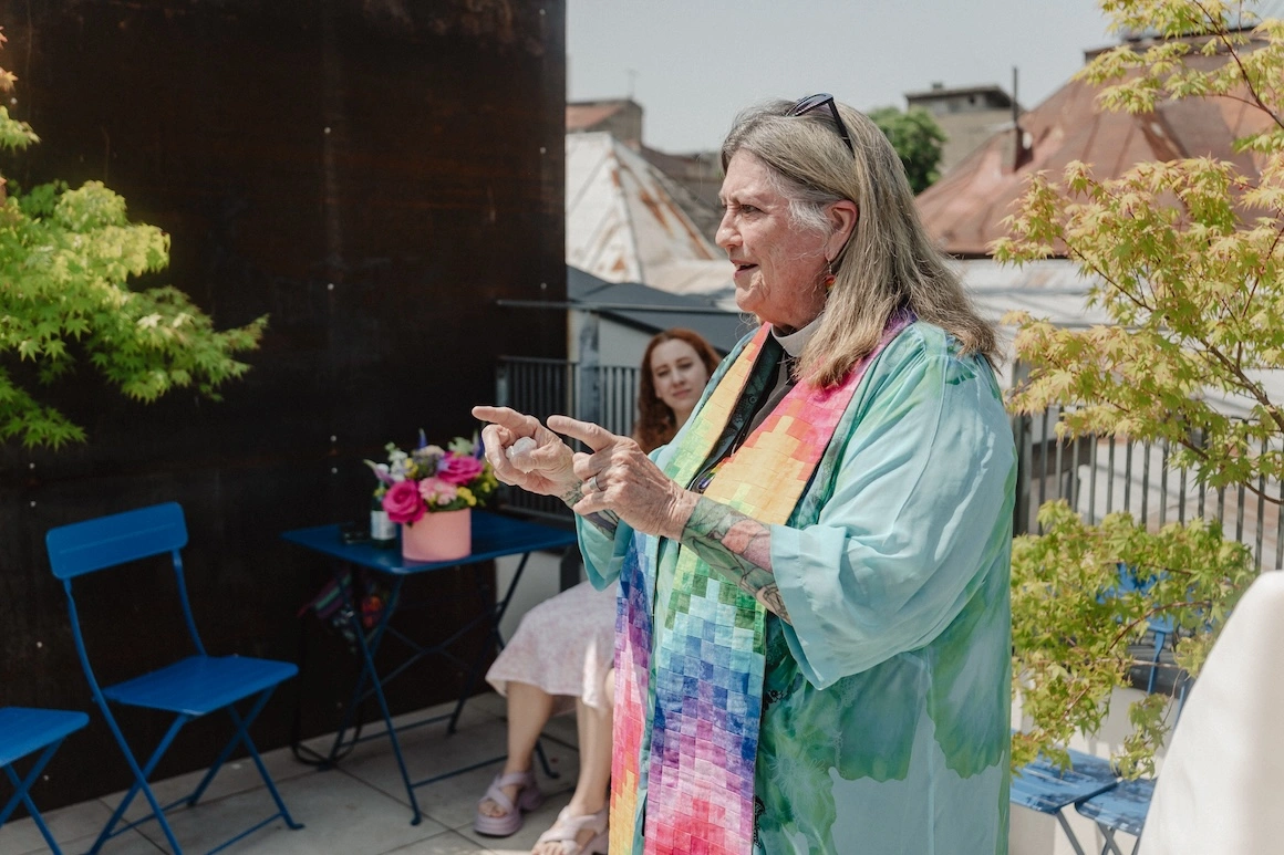 Fisher a binecuvântat peste 10 cupluri de vârste diferite. Fiecărora le-a vorbit despre dragoste, acceptare, compasiune. Sub tunica albastră i se întrezăreau tatuajele care-i acoperă brațele. Reprezintă momentul biblic în care Miriam și alte femei dansează după ce au trecut Marea Roșie, scăpând astfel din sclavie. Povestea lor reunește multe teme importante pentru Diane: rolul important al femeilor în credințele abrahamice, eliberarea prin dans și bucuria victoriei împotriva opresiunii. „Primul marș al libertății. Primul Pride”, spune ea când am întrebat-o despre asta.