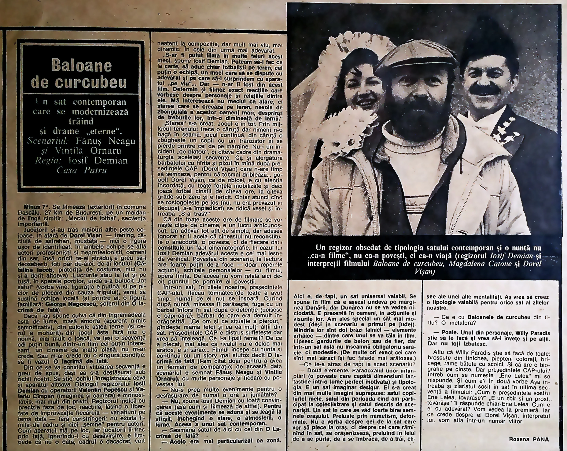 În 1981, Iosif Demian tocmai urma să înceapă filmările pentru cel de-al treilea lungmetraj regizat de el, după un scenariu scris de Fănuș Neagu și Vintilă Ornaru. Cu mâinile în grâu era povestea unui sat cu CAP fruntaș, al cărui președinte e prins într-o poveste zbuciumată de dragoste. „La prima întâlnire cu organele de partid care urmau să avizeze intrarea în producție a filmului,” povestește Demian, „unul dintre tovarășii prezenți a găsit neinspirat titlul scenariului și a cerut să fie schimbat. Fănuș Neagu, deși vădit iritat, l-a întrebat pe un ton amabil: «Vă simțiți cumva cu musca pe căciulă?». «Toți avem câte o muscă pe căciulă», i-a răspuns tovarășul. «Atunci să-i zicem Baloane», a fost rândul lui Fănuș Neagu. «Baloane de curcubeu». Și așa a rămas.” Baloane de curcubeu (1982) e o comedie neobișnuită despre viața satului, un carnaval pe ulițe pline de noroi. În ea joacă, printre alții, Magda Catone, care tocmai își făcuse debutul cu un an înainte, într-un rol secundar din De ce trag clopotele, Mitică? al lui Pintilie, și Dorel Vișan, cu care Demian lucrase și în '80, la O lacrimă de fată, selecționat la Cannes și premiat de Uniunea Cineaștilor pentru regie.