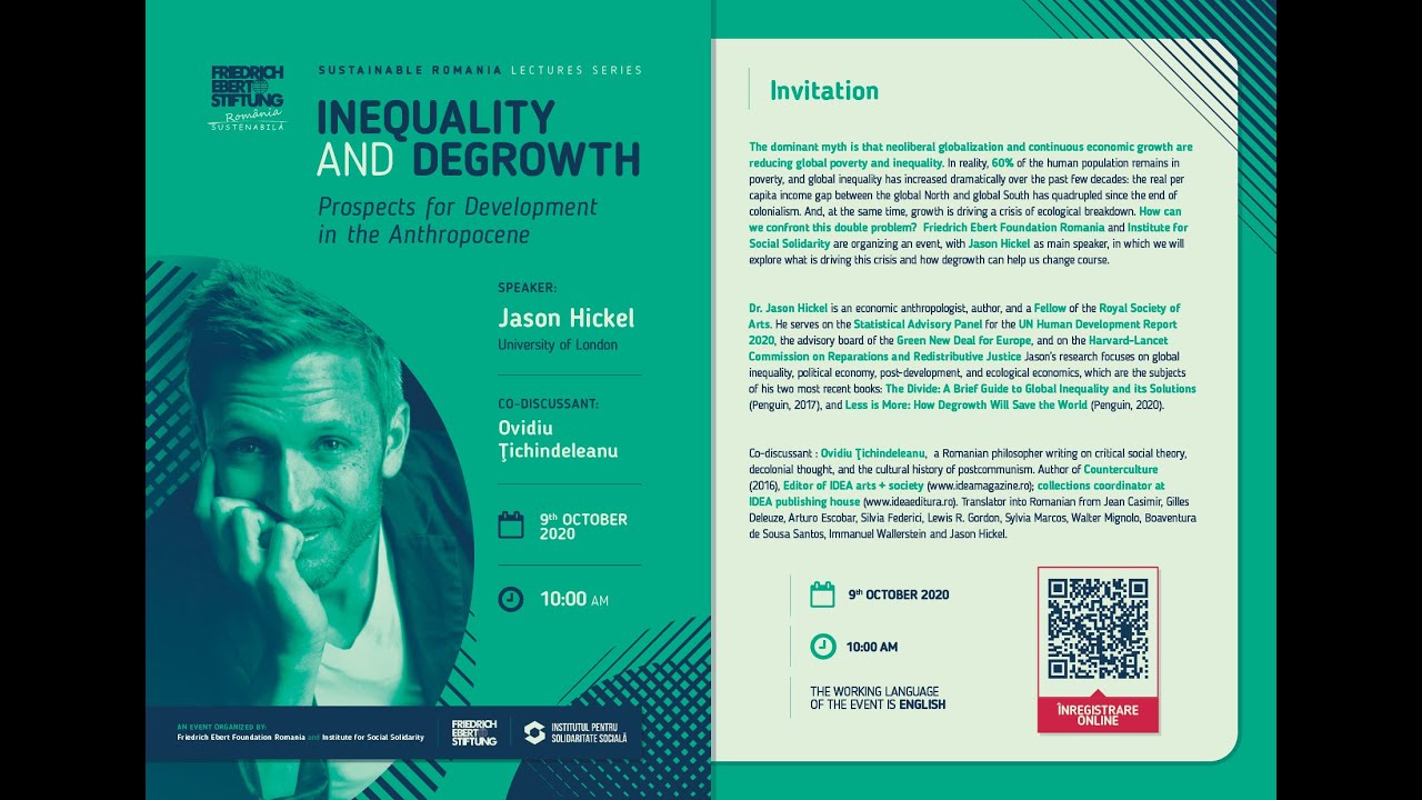 Despre toate astea scrie și vorbește antropologul Jason Hickel, care tocmai a publicat o a doua carte, Less is More: How Degrowth Will Save the World (Penguin, 2020), după Diviziunea (2017; tradusă în limba română de Ovidiu Țichindeleanu, la Editura Ideea). Hickel, născut în Swaziland, în timp ce părinții săi munceau acolo ca medici, în plină criză provocată de HIV/SIDA, spune că soluția nu e să continuăm să ne dezvoltăm abulic. Ba chiar din contră - antropologul propune o contra-dezvoltare. Despre conceptul de degrowth („descreștere”) a națiunilor dezvoltate, reguli comerciale nedrepte și dezastrul ecologic spre care se îndreaptă planeta a vorbit recent și cu Țichindeleanu, într-o întâlnire online organizată de  Friedrich-Ebert-Stiftung România and Institutul pentru Solidaritate Socială. O puteți urmări integral mai jos - iar, în pregătire, puteți citi interviul pe aceleași teme presante, care ne vizează pe toți.
