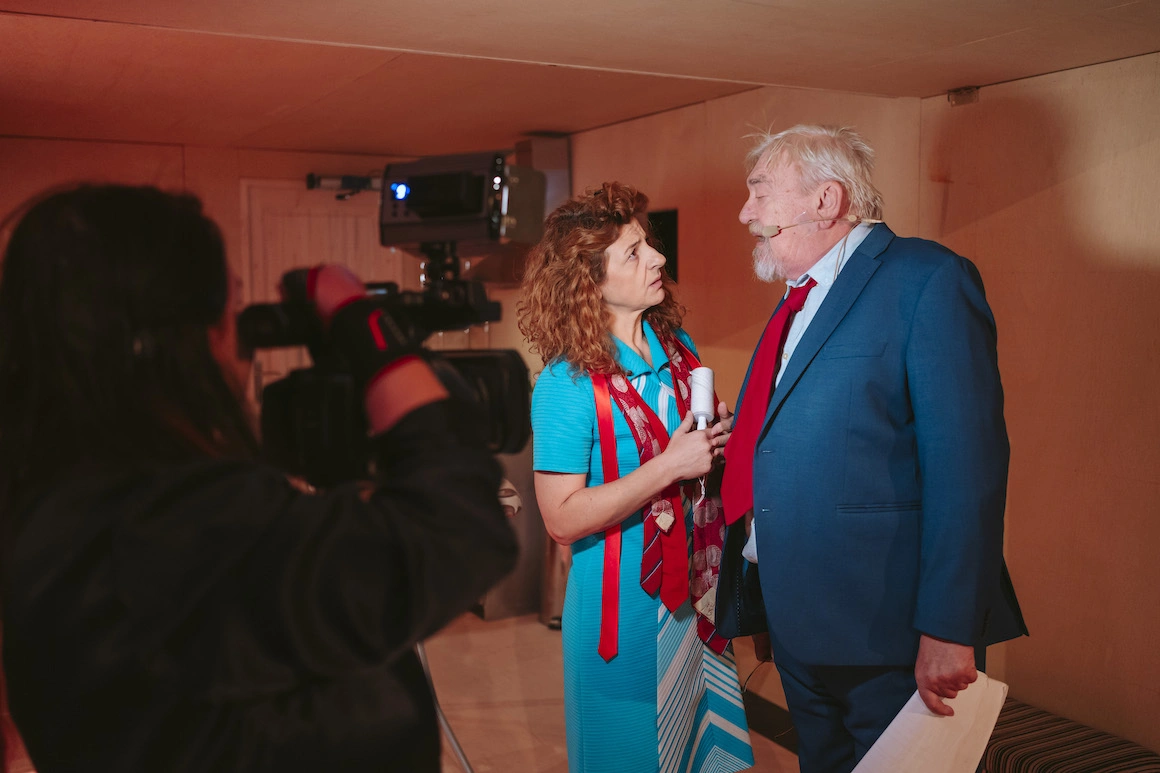 Paradigma rămâne în esență aceeași în spectacol, dar Cărbunariu ajustează detaliile: Odeon devine Nottara, iar spectacolul la care se repetă este chiar spectacolul pe care îl vedem, motiv pentru câteva ieșiri de diferite grade din convenție. Actorii comentează repetițiile, uneori în dialog cu regizoarea aflată undeva, în zona tehnică (vocea îi aparține chiar Gianinei Cărbunariu), „recuziterul” Mircea (Alexandru Jitea), care este și sufleor, și corepetitor de nevoie, ia locul „actorului” Alex (Jitea, desigur), absent, și dă replicile „în alb” în rolul soțului Stelei, recuziterul Mircea. Mai mult, în ultima scenă, Stela și Mircea merg la premiera propriului spectacol în care joacă – meta-convențiile spectacolului sunt nu doar numeroase, ci și fluide căci pe unul dintre palierele (ne)convenționale, recuziterul_și_sufleorul Mircea, care nu e soțul Stelei, intră în dialog cu actrițele Crenguța Hariton și Daniela Minoiu în ipostaze cameo, care își dispută personajele (prea) în vârstă (bunici) pe care le joacă în spectacol, prilej de a chestiona nu doar cine pe cine reprezintă, ci și statutul actrițelor mature în relație cu oferta de roluri pentru vârsta lor.