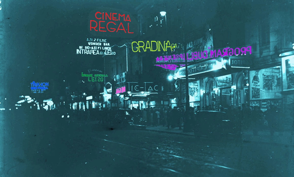 Foto main: Bukarest: Leuchtreklamen (1935), Landesarchiv Baden - Württemberg, Staatsarchiv Freiburg, fotografie de Willy Pragher, colorizată