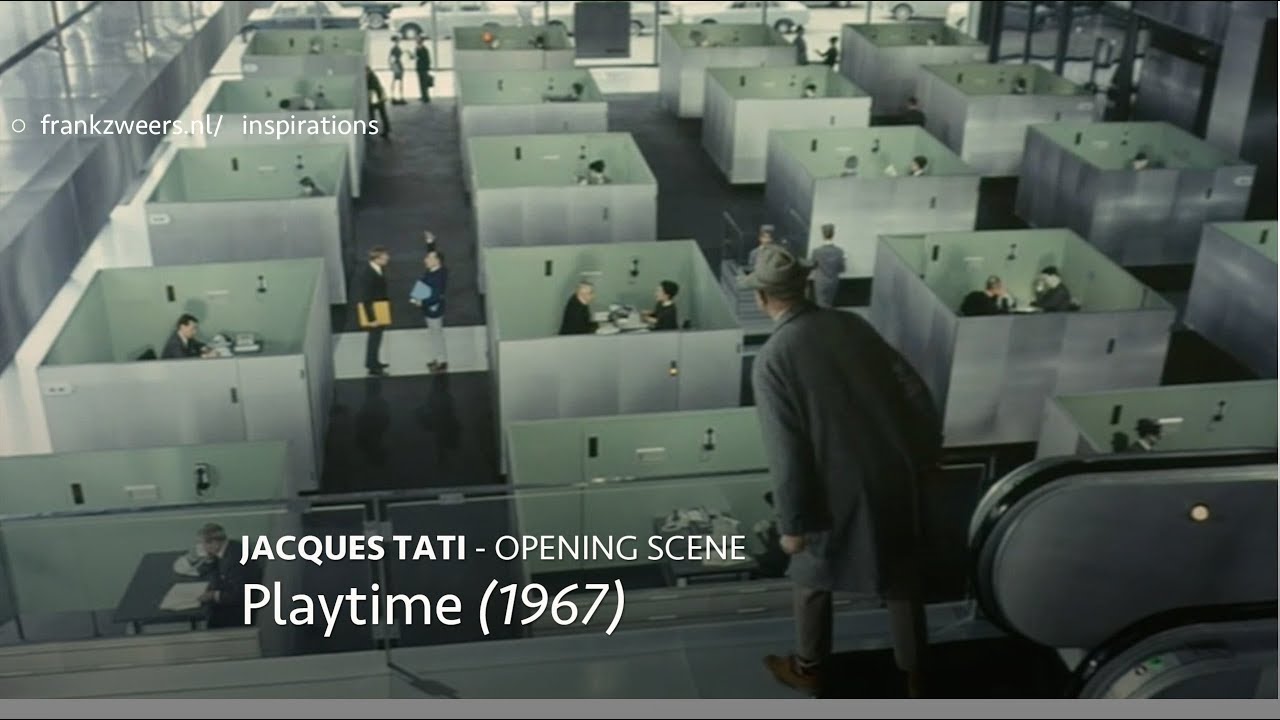 A. Regizorul Jacques Tati s-a născut în 1907 în Franța și a avut un bunic de origine nobiliară rusească. A terminat armata la 20 ani, a fost un jucător semi-profesionist de rugby și și-a descoperit talentul accidental, când îi amuza pe colegii săi sportivi cu niște numere spontane de pantomimă. Influențele sale de slapstick comedy sunt evidente - personajul său-emblemă, Monsieur Hulot (jucat chiar de Tati), e un fel de Vagabondul lui Chaplin complet pe dos - are haine scurte, o figură filiformă, un fel de eleganță desuetă (în răspăr cu timpurile, are mereu o pipă din care trage pe ascuns, o pălărie și un palton generic) și un pășit caraghios. Deși ambii eroi, atât al lui Chaplin, cât și al lui Tati sunt mai degrabă stângaci și atehnologici (în sensul că tehnologia le aduce mari bătăi de cap), e o diferență de clasă între ei, exprimată mai ales prin eleganța asta nobiliară a personajului lui Tati. Vagabondul lui Chaplin e inadaptat și pentru că n-are loc în lumea de afară, oricât ar încerca să se potrivească - e neîndemânatic, neatent, visător și sărac. La antipod, Hulot e un individ ceva mai înstărit cu o pasiune pentru tot felul de detalii distractive, dar destul de atașat de realitate: felul în care arată lucrurile din jur (obsesia pentru scaune), felul în care funcționează lucrurile în plin progres tehnologic (în Playtime, Tati rămâne blocat într-un magazin, încurcându-se în bara metalică rotativă de la casa de marcat).