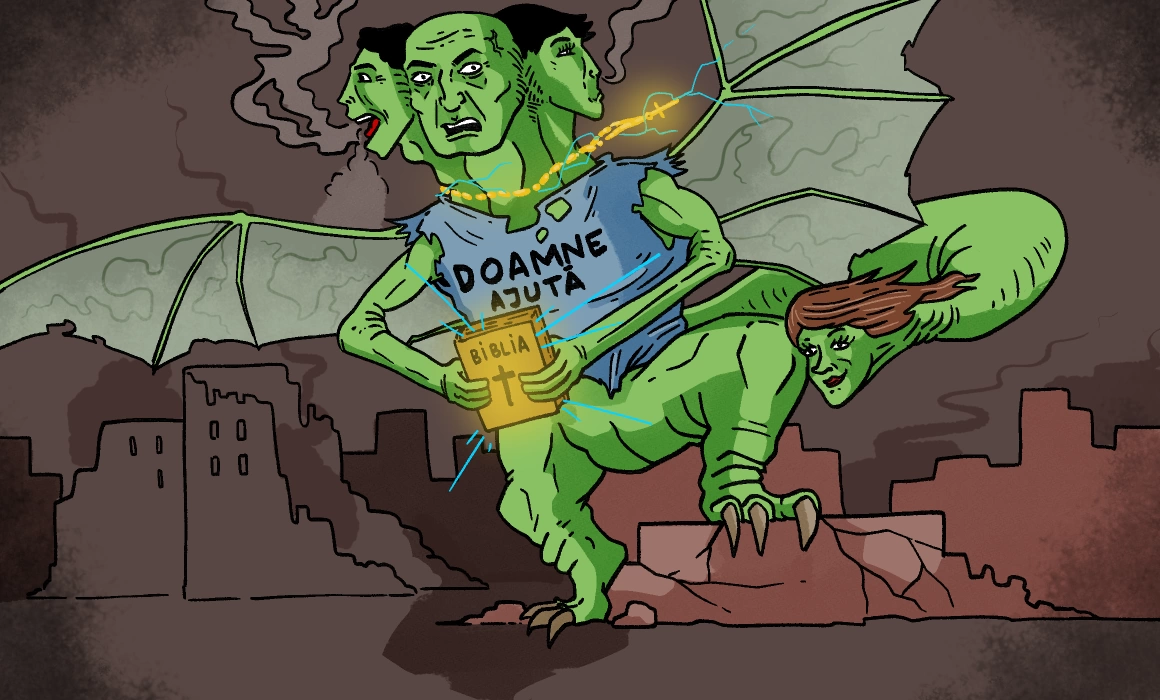 La televizor, un medievist și un teolog îndemnau populația să se roage la Monstrul Familiei Tradiționale. Nu este un monstru, ci un înger, a zis teologul, făcut după chipul și asemănarea familiei creștine. Capul este tatăl. Din fălci îi ies copiii, un băiat și o fată, după ce-i mestecă în primii ani de viață, pentru a le întări caracterul. Iar femeia e în coadă, însă doar spațial. Spiritual, ea pune corpul familiei creștine în mișcare, pentru că ăsta e rolul cozii. Medievistul se pregătea să recite o poezie, iar teologul a luat un glob pământesc în brațe și a început să-și plimbe degetul pe suprafața sa: deci ce este ideologia woke, mă întrebați? E peste tot, e aici și aici, uitați-vă și dumneavoastră (medievistul și realizatorul emisiunii se uitau consternați la globul pământesc). Aici e un tată care nu poate dormi pentru că fiul lui vrea să fie fiică, iar aici e o mamă care nu va avea niciodată nepoți pentru că fiica ei se sărută cu o fată! Uitați-vă cum se sărută!