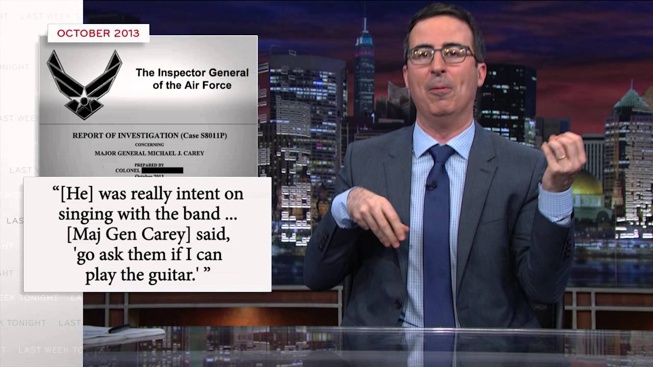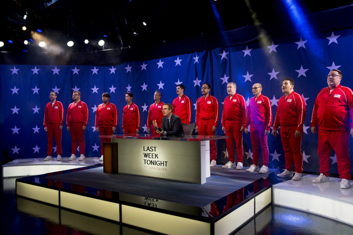 John Oliver intră în sala de ședințe și trece-n alergare pe la fiecare în parte. Salut, eu sunt John! E îmbrăcat în costumul de show, patru ace, eleganță britanică. Înainte de Last Week Tonight, Oliver era mai zburlit, mai casual. Acum e ca scos din cutie. Ca să poți face poante despre pedeapsa cu moartea sau regimul armelor în America, trebuie să arăți cel puțin prezentabil.