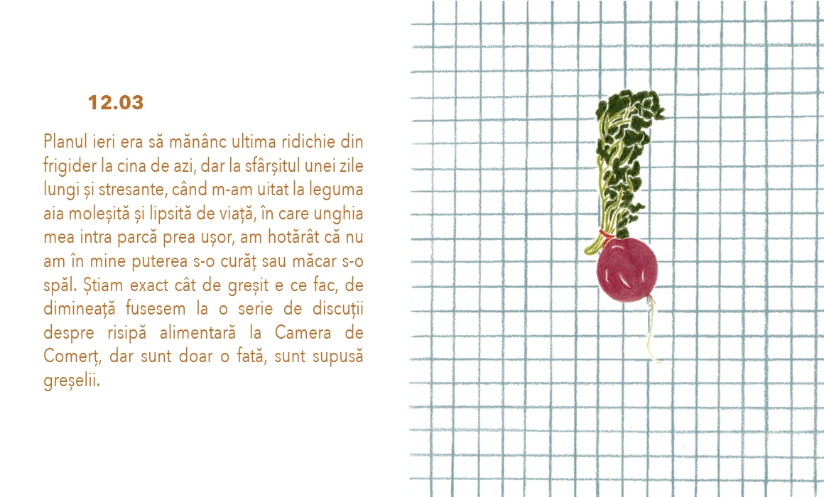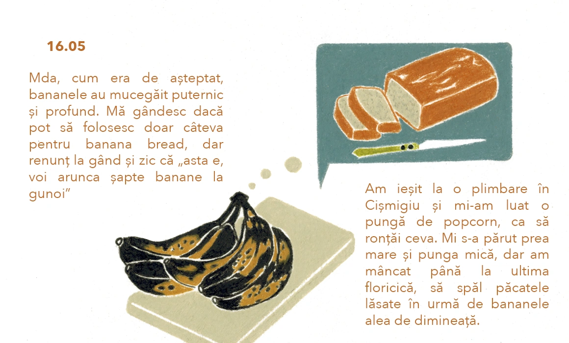 Pentru că plec mâine pe teren, la Arad, pentru câteva zile, am decis să fac curățenie în frigider. Am găsit niște boabe de rodie, care miroseau prea tare a alcool, așa că nu am avut cum să le dau o nouă viață într-un smoothie sau orice altceva mai face Marnela din Cehia pe TikTok. Am mai găsit o jumătate de lime și o cutie cu puțină brânză feta expirată. Cred că mă simt presată de jurnal și mă gândeam dacă să mănânc brânza. „În fond, o am doar de trei săptămâni? E puțin galbenă, dar cine știe?” Am eliminat rapid gândurile pentru că nu voiam să mă pricopsesc cu vreo boală la stomac cu o zi înainte să plec la peste 500 km depărtare de casă. Așa că acea brânză a ajuns la coșul de gunoi