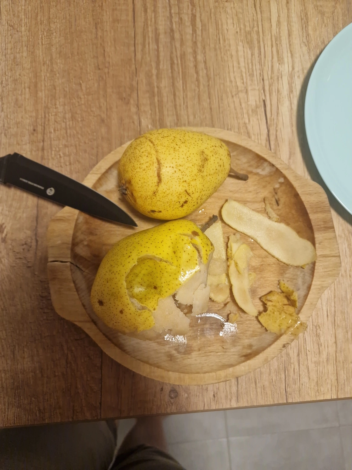 În weekend au fost părinții mei la mine. Mama a gătit tot weekendul, și acum am în frigider papricaș, ciuperci cu brânză și multe altele. Dar aș zice că am încercat să risipim cât mai puțin. Codițele de la ciuperci sunt în congelator, la fel și niște grăsime din puiul de casă care n-a mai ajuns în papricaș, dar va fi bază pentru o viitoare supă de tăiței. Pentru că încă mai aveam în frigider perele alea, am rugat-o pe mama să-mi facă un chec pornind de la ele. Mă rog, de la ea, că una nu mai era comestibilă. La plecare ai mei au luat acasă și bidonul în care strângeam uleiul de la gătit pentru reciclat. Se pare că bunica îl amestecă cu mâncarea porcilor, practic, anti-risipă alimentară fără pretenții.