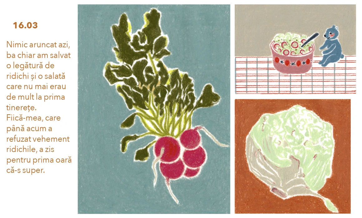 Faptul că țin un jurnal de risipă alimentară dă roade. Sunt mult mai atentă cu ce mănânc și arunc, parcă s-a instalat un soft nou care rulează în fundal de fiecare dată când mă gândesc ce mâncăm azi. O victorie minusculă: am reușit să salvez jumătatea de conservă cu porumb, pe care altminteri aș fi aruncat-o mai mult ca sigur, într-un orez cu legume. N-am aruncat nimic.