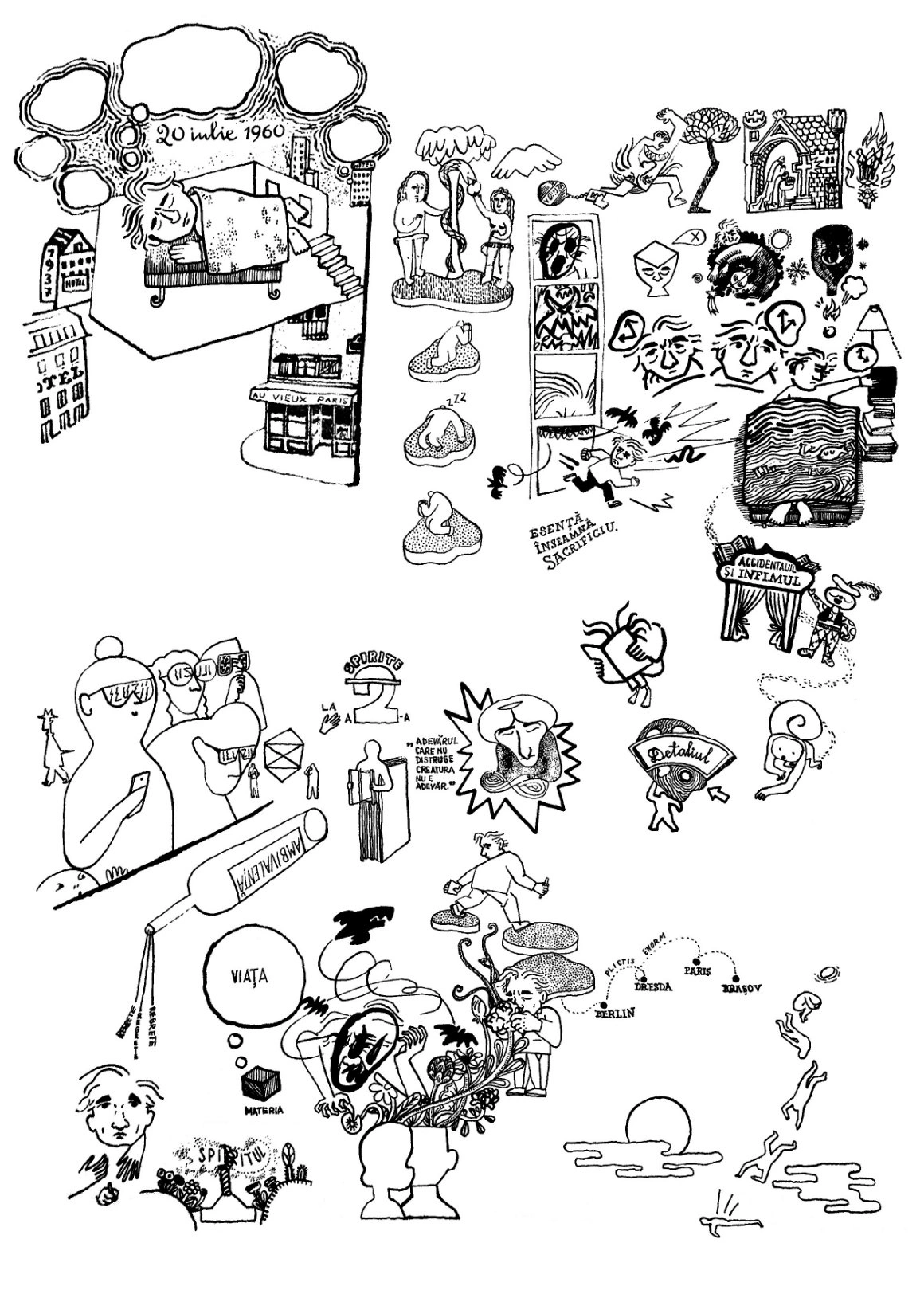 Așa că am concentrat jurnalul în 7 ilustrații, pe care vă propun să le colorăm împreună: le puteți descărca și printa, după care vă scoateți din sertar culorile și (în)locuiți cu ele alb-negrul nihlist. Sau, dacă tot avem sertare fără fund în care zac culori digitale, luați-vă câteva minute de Photoshop. Așteptăm versiunile voastre de Cioran în culori la editorial@scena9.ro sau direct în comentarii. Facem împreună o galerie care i-ar smulge și autorului măcar un zâmbet.