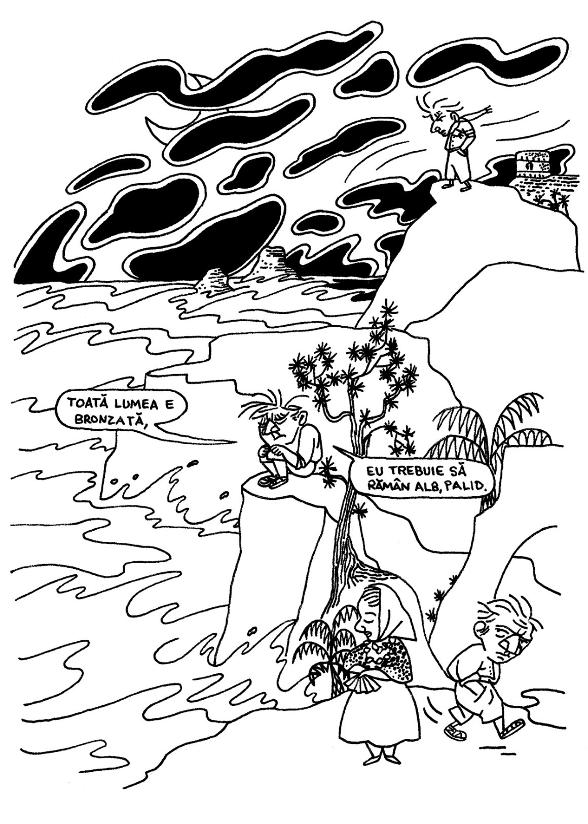 «Astă-noapte, pe la ora trei, m-am trezit de tot. Imposibil să mai rămân în pat. M-am dus să mă plimb pe malul mării, mânat de gânduri cum nu se poate mai negre. Ce‑ar fi să mă arunc din înaltul falezei? Am venit aici pentru soare, şi nu pot suporta soarele. Toată lumea e bronzată, eu trebuie să rămân alb, palid. În timp ce făceam tot felul de reflecţii amare, am privit pinii, stâncile, valurile „bătute“ de lună, şi brusc am simţit în ce măsură sunt înlănţuit de acest splendid univers blestemat.