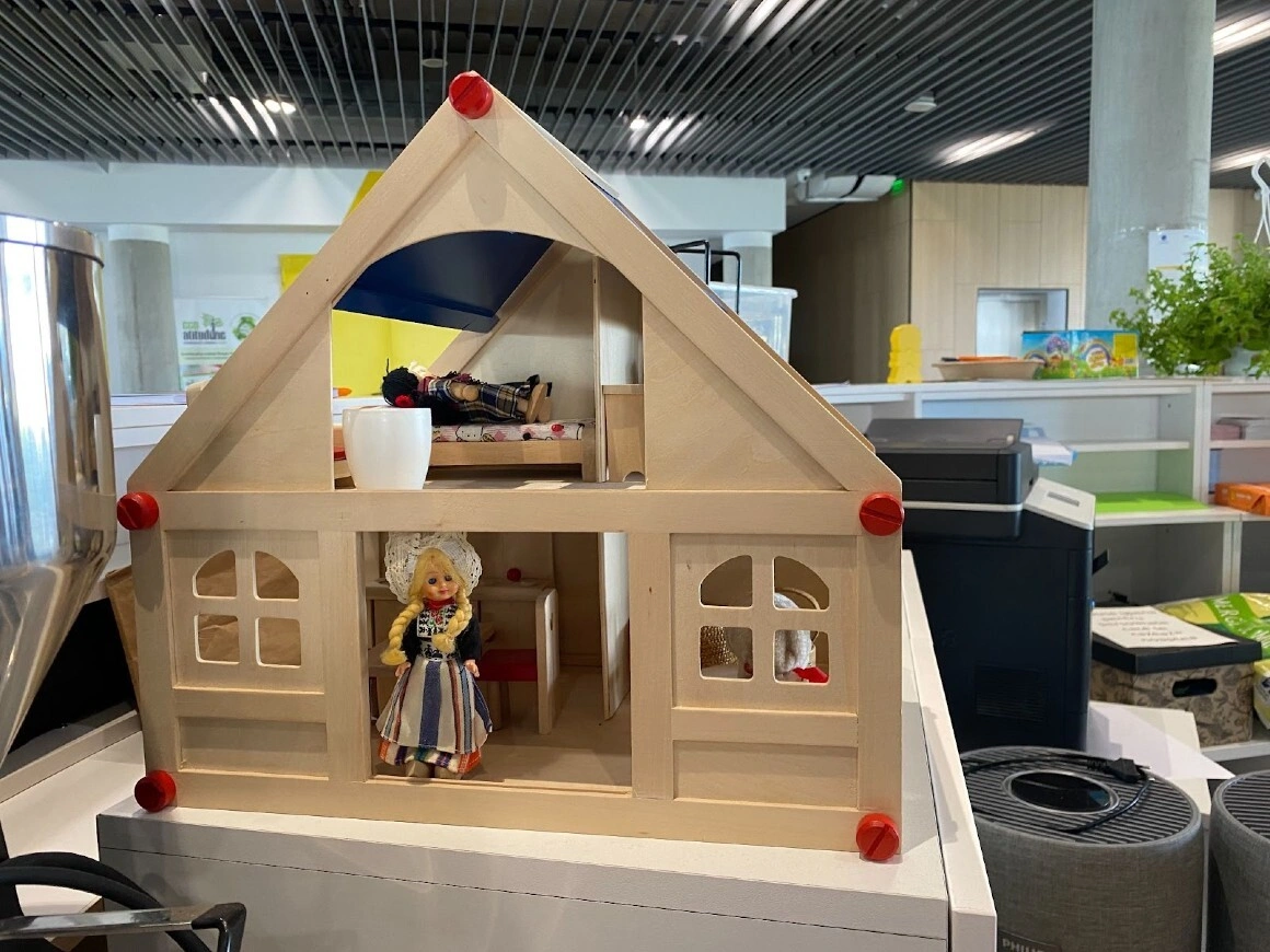 - O căsuță de păpuși, cu păpuși și mobilier de lemn