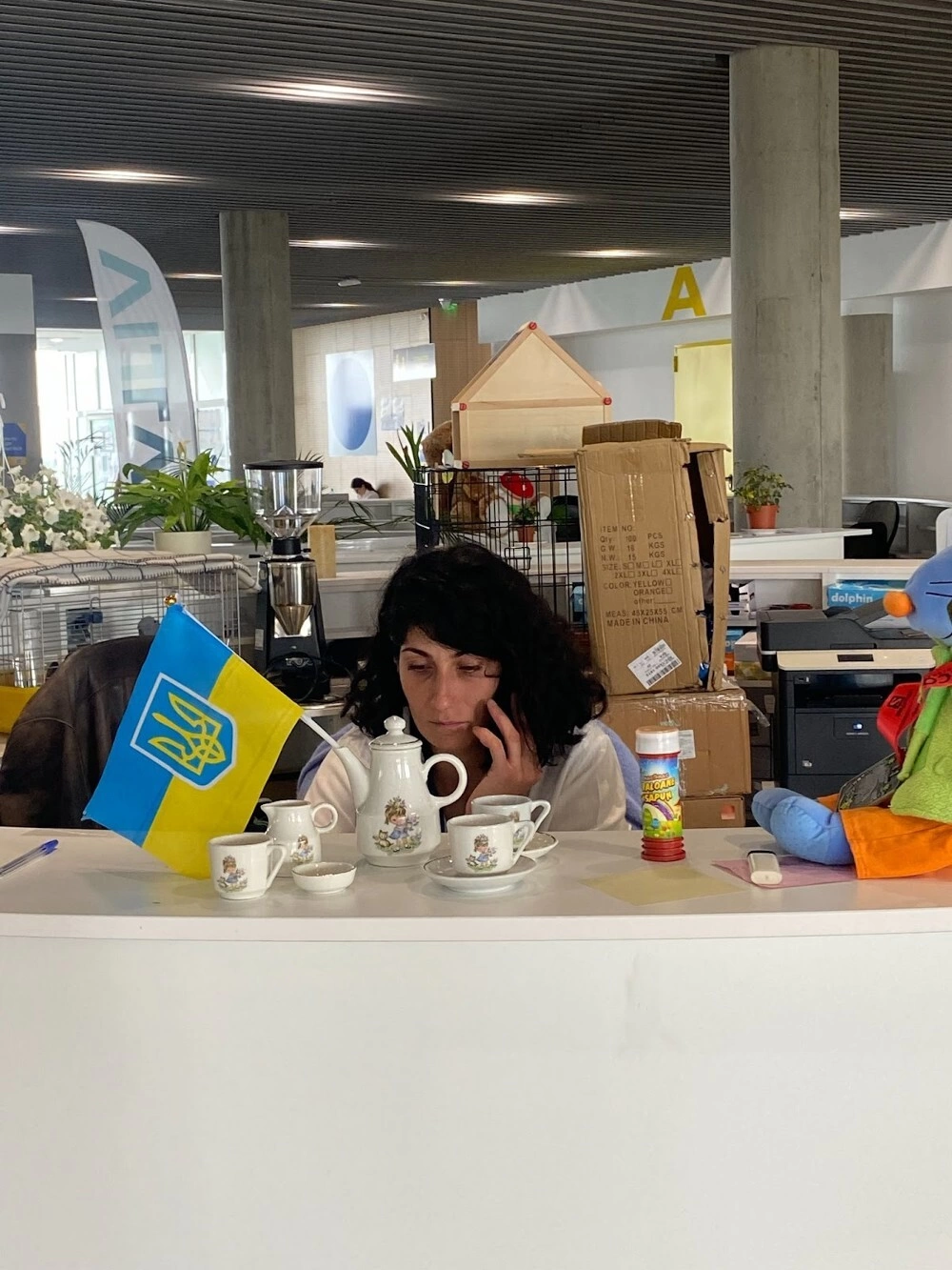 Întregul ei birou e înfășurat într-un steag al Ucrainei lung de câțiva metri. Un curcubeu de hârtie îi atârnă deasupra capului. Aici e turnul de control al centrului de refugiați din Brașov. De aici, Andreea are vedere la magazinul social, la locul de joacă, la depozit, înspre clasele copiilor, pe terasă, înspre biroul de înregistrări și înspre amfiteatru.