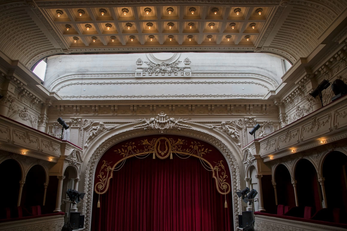 CORTINĂ. Cea originală a sălii Majestic era cusută manual de măicuțe, însă la un moment dat a luat foc. Teatrul a căpătat una nouă în timpul renovării de după 2010. Ar mai fi o mențiune aici: sala mare are 299 de locuri, iar proiectantul s-a oprit acolo pentru că de la 300 de locuri în sus, regulamentul cere și o cortină de fier care să protejeze sala, în cazul în care pe scenă sau în spatele ei pornește un incendiu.