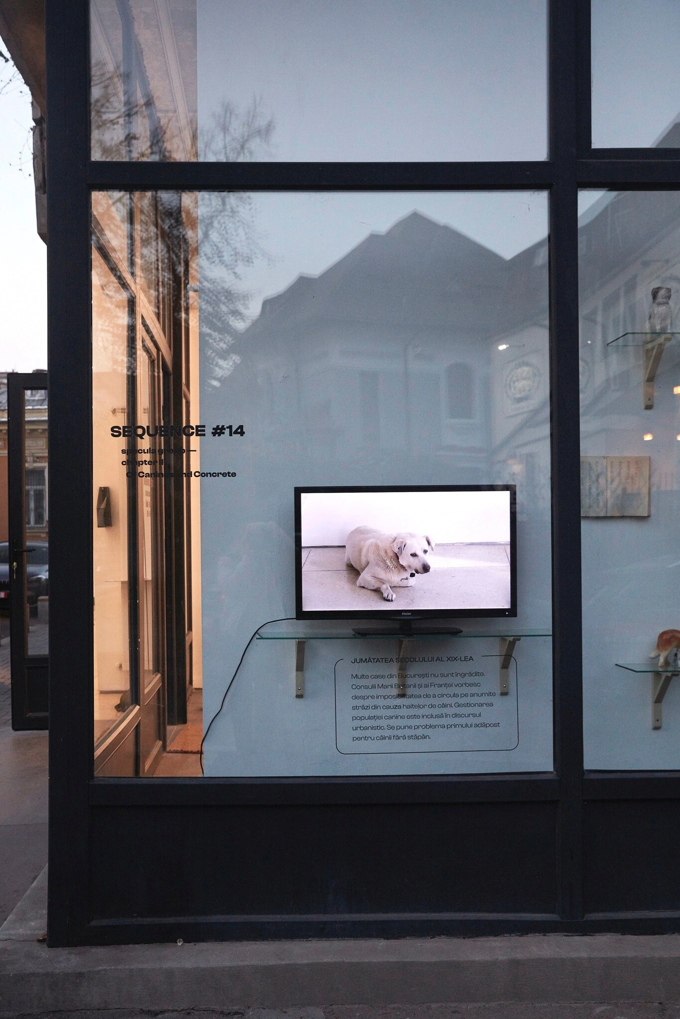 Textele din geam realizează o narațiune a istoriei câinelui comunitar și a relațiilor sale cu omul. Conform acestora, atenția asupra câinelui apare în secolul  XIX, odată cu populația mărită de maidanezi ce suscită interes pentru construirea unui adăpost pentru câini. Ulterior, în secolul XX, se înființează societatea pentru îmbunătățirea rasei canine, o societate ce prevede, într-un soi de eugenie, cultivarea raselor de câini la nivel local; dar această societate este curând desființată, odată cu venirea comunismului.