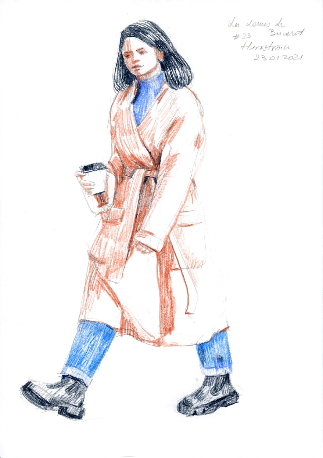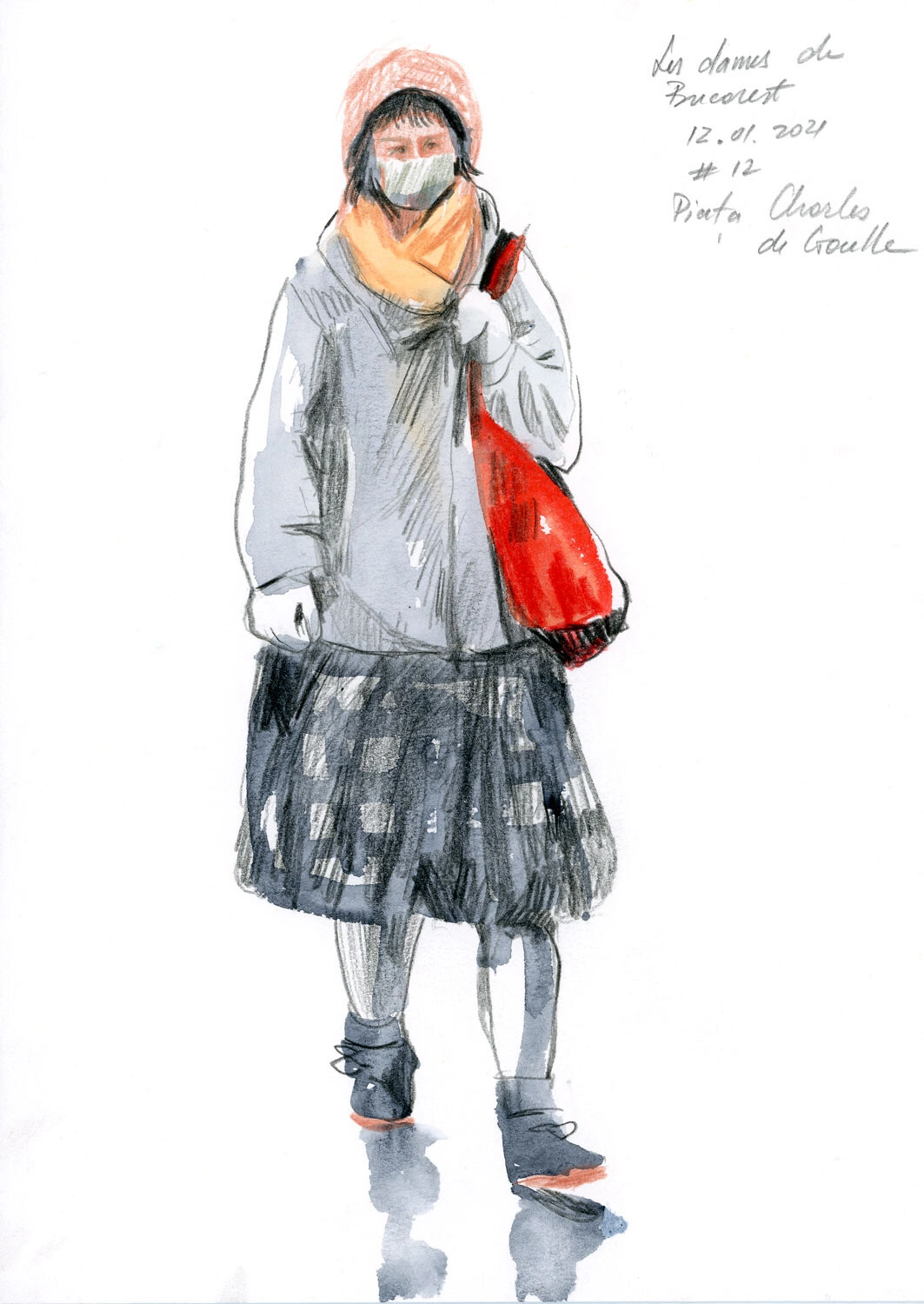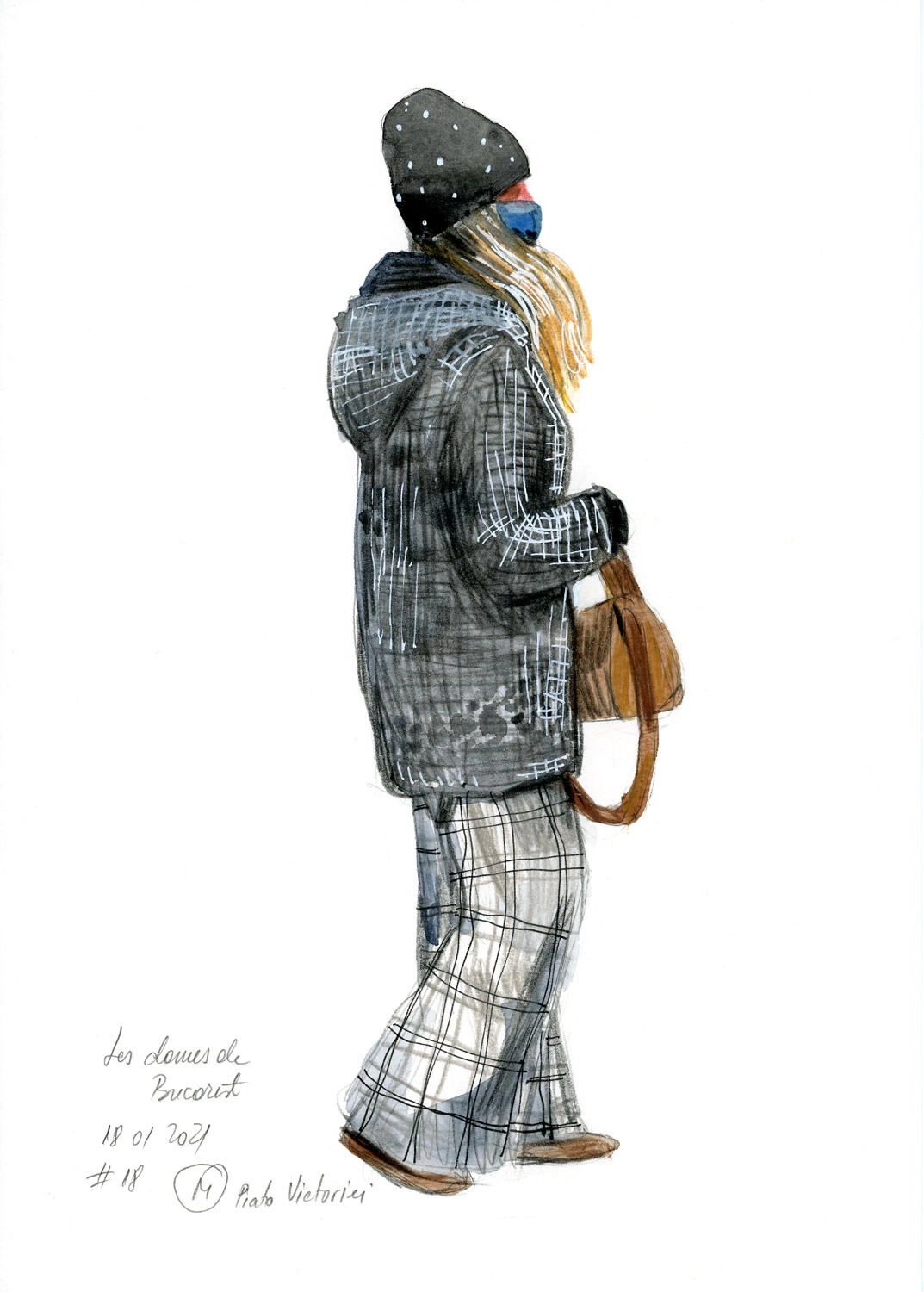 Într-una din zilele mohorâte din prima lună a anului, în grupul de chat de redacție a aterizat o siluetă feminină, delicat schițată de Georgiana Chițac. Așa am făcut cunoștință cu proiectul ei, „Les dames de Bucarest”, prin care ilustratoarea își propune să documenteze al doilea an al pandemiei noastre prin femeile care colindă capitala. (Îl găsiți integral pe contul ei de Instagram, @methedreamer, sau direct sub hashtag-ul #lesdamesdebucarest.)