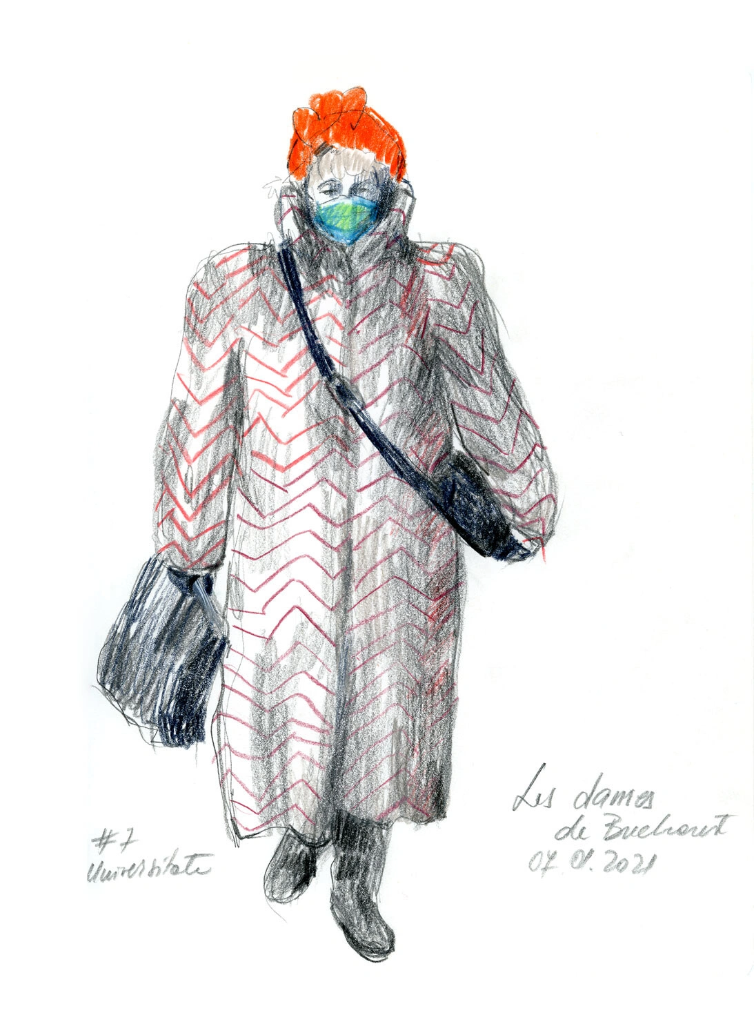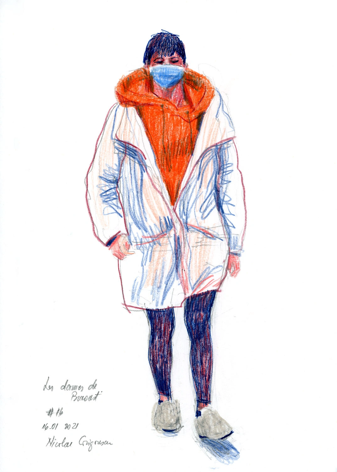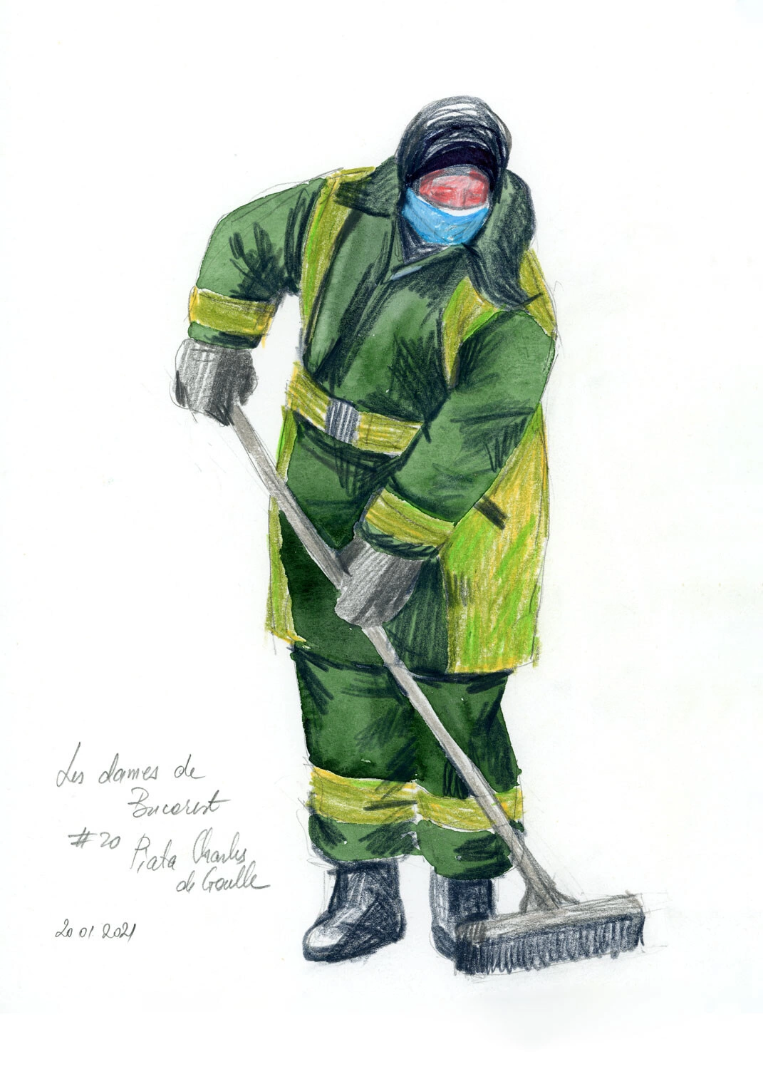 Într-una din zilele mohorâte din prima lună a anului, în grupul de chat de redacție a aterizat o siluetă feminină, delicat schițată de Georgiana Chițac. Așa am făcut cunoștință cu proiectul ei, „Les dames de Bucarest”, prin care ilustratoarea își propune să documenteze al doilea an al pandemiei noastre prin femeile care colindă capitala. (Îl găsiți integral pe contul ei de Instagram, @methedreamer, sau direct sub hashtag-ul #lesdamesdebucarest.)