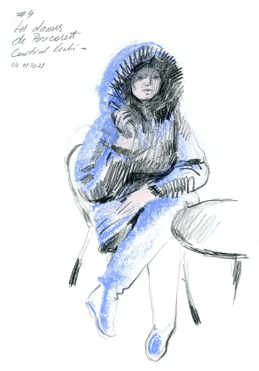 Ideea mi-a venit în urmă cu 4 ani. Abia îl născusem pe fiul meu. Eram prinsă în îngrijirea lui perpetuă, iar plimbarea zilnică făcea parte din protocol. Eram dornică să desenez, iar femeile au fost subiectul care mi-a sărit în ochi în timpul plimbărilor. Am realizat câteva, am abandonat însă repede proiectul, fiind depășită de situație, de propria stare, de evenimentele care uneori tind să se succeadă halucinant de repede. Am avut nevoie de 3 ani de lucru într-un mediu controlat (pentru prima dată aveam propriul atelier, departe de zumzetul de acasă), de o pandemie și de o schimbare de atitudine ca să am curajul să reîncep acest proiect, de data aceasta cu un obiectiv mult mai precis, și anume să documentez anul 2021 prin intermediul femeilor din București.