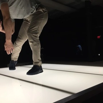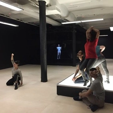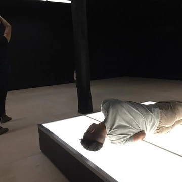 „O să-ncerc acum să produc un sens, iar tu o să interpretezi relații care sunt pierdute, îngropate sau uitate”, spune (aprox.) unul dintre dansatorii din „Co-Natural”, on display la New Museum din New York până în aprilie, un performance în buclă, pe întreaga durată a zilei de muzeu. Publicul intră într-o sală în care cinci dansatori-performeri construiesc și deconstruiesc un discurs despre corp și felul în care istoria se reflectă în mișcările, în ezitările, în prezența și absența lui. Al șaselea dansator e și nu e prezent: într-o piramidă de sticlă, holograma lui Farid Fairuz neliniștește vizitatorul. În fața imaginii unui corp care pare chiar omul însuși, gestul cel mai frecvent pe care l-am observat într-o oră și ceva a fost capturarea imaginii pe ecranul telefonului (cum am făcut și eu cu gif-ul de mai jos), plus o privire plină de mirare și neîncredere, cam cum aveau probabil oamenii în fața primelor imagini mișcătoare din secolul 19: