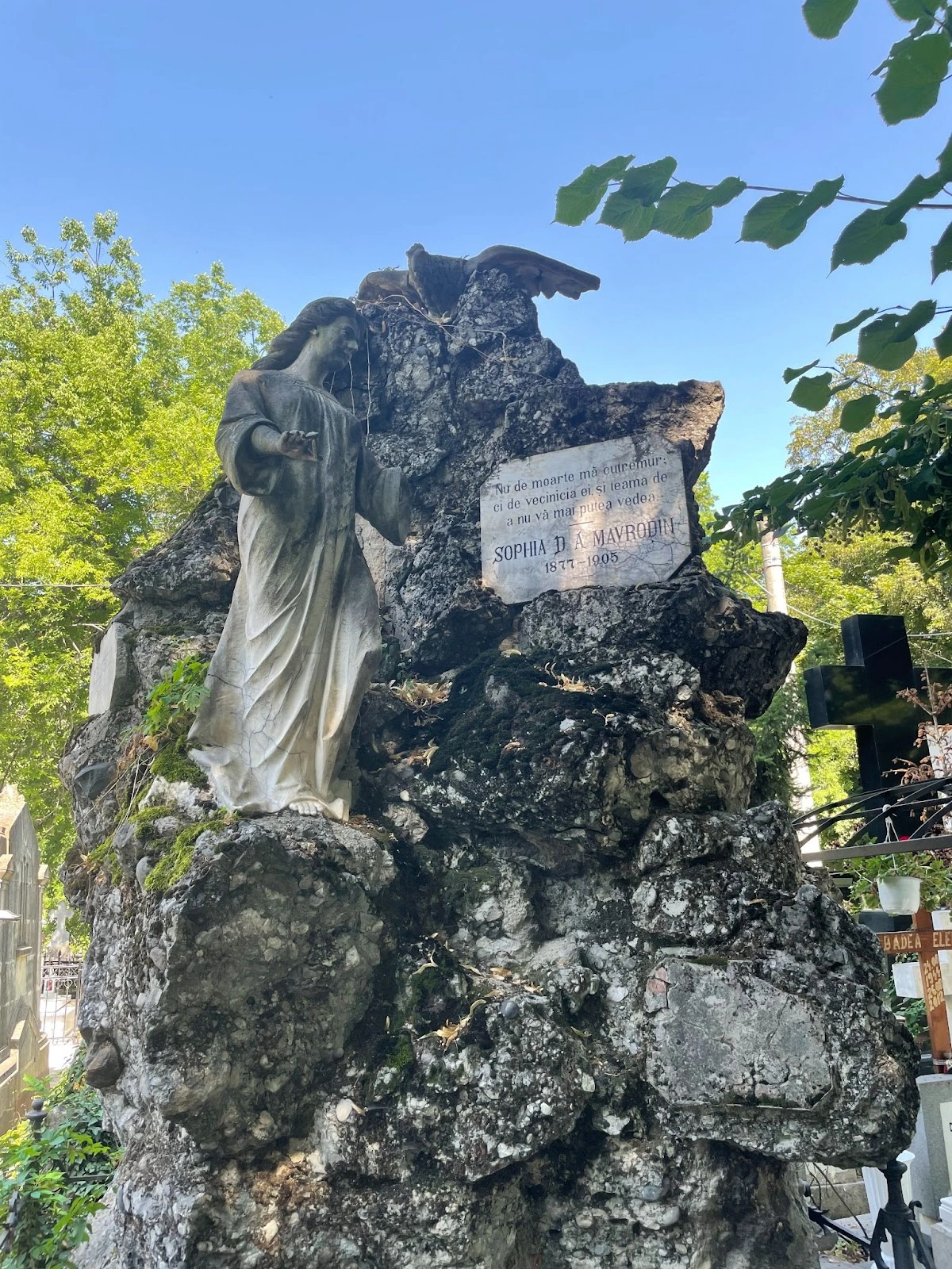 Sincer, majoritatea sculpturilor mele favorite din București se află în cimitirul Bellu. Am petrecut foarte mult timp acolo și cred că e, probabil, cel mai bun loc din oraș în care să vezi sculptură românească. Sunt atâtea monumente și povești fantastice în Bellu, dar dacă ar fi să aleg una pe care o iubesc, ar fi mormântul Sofiei Mavrodin, realizat de Constantin Bălăcescu. Sophia era o tânără alpinistă de la sfârșitul secolului 19 care a căzut de pe o stâncă și a murit după ce a fost atacată de un vultur care-și proteja puii. Îndoliat, tatăl i-a ridicat un monument care e, jur, o replică la scară mică a vârfului de pe care a căzut. Făcut din bucăți din aceeași stâncă, tatăl a angajat muncitori care să o spargă și să o transporte, piatră cu piatră, la București. Sofia e portretizată ca un înger de marmură care urcă spre munte, dar partea care mă emoționează este că tatăl a ales să comemoreze și vulturul, spunându-i lui Bălăcescu să îl toarne în bronz și să îl așeze în vârf. Este o relație cu moartea pe care o întâlnești într-un loc ca Bellu. Nu știu dacă este o realitate românească de secol 19 sau doar nu e comun locurilor din care provin eu, dar e intrigant și o sursă de inspirație pentru mine.