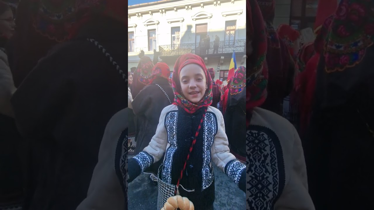 Miruna, o fată de 11 ani din comuna Vatra Moldovitei, Suceava, recită plină de patos și energie o urare adaptată pentru sigheteni.