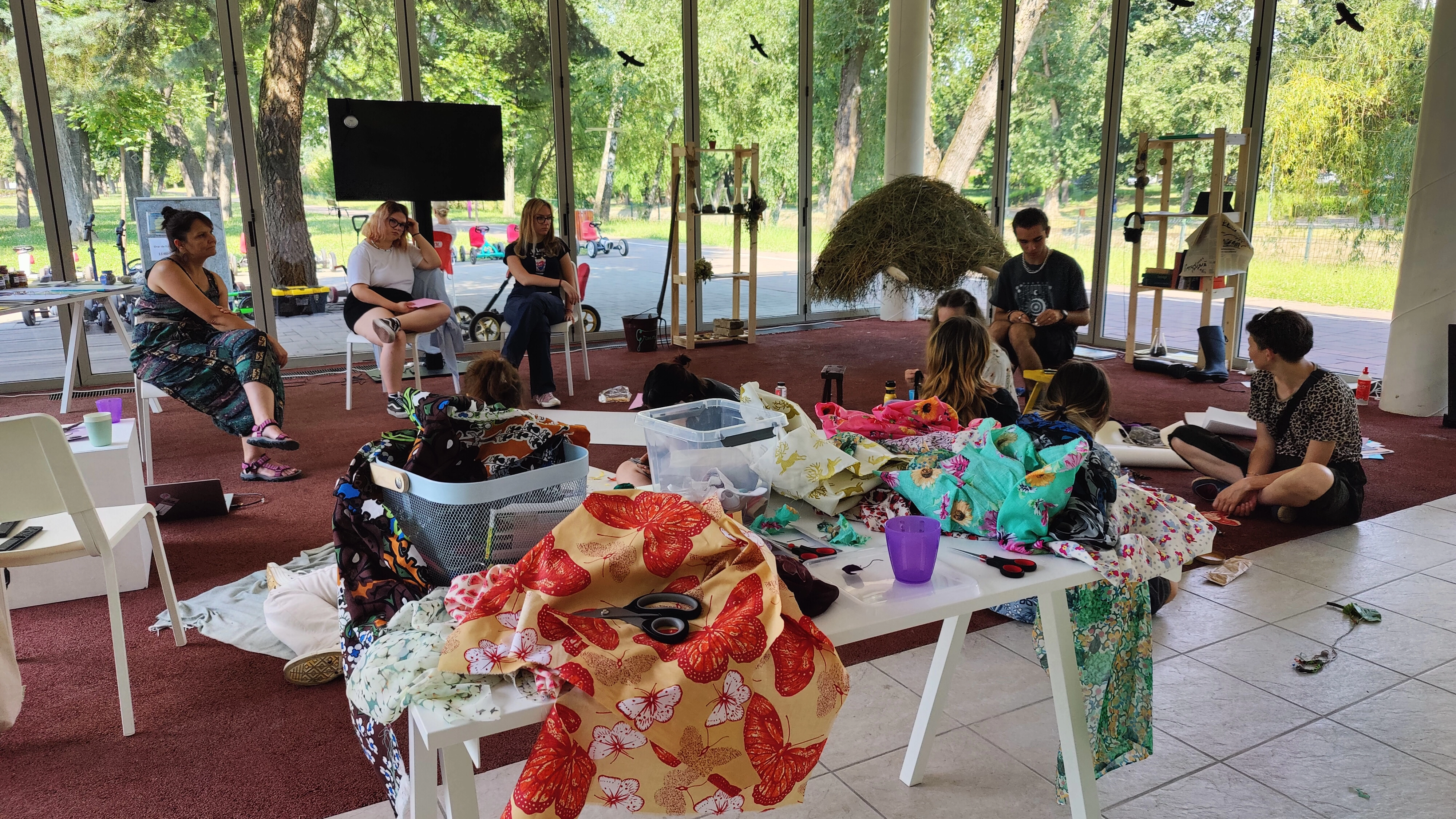 Am început cu o meditație, un exercițiu de concentrare asupra sunetelor din jur, menit să ne facă să ne simțim mai mult ca niște ființe vii (bine, nu ne-au ajutat numeroșii copii din jur, care claxonau intens de pe trotinete). Apoi, Nita ne-a propus să coasem niște amulete, ancorate în această ecologie magică. „Obiectele au o latură psihologică, te pot desprinde de gândurile tale. Mereu când apelezi la o amuletă îți amintești la ce te gândeai când ai făcut-o. Amuletele au intenție.” Scopul exercițiului era să devenim atenți la ce facem și cum lucrăm cu mâinile, iar intenția amuletelor este să ne amintească activitatea concretă prin care au fost realizate. Magia e în felul în care modifici ceva ce gândești.