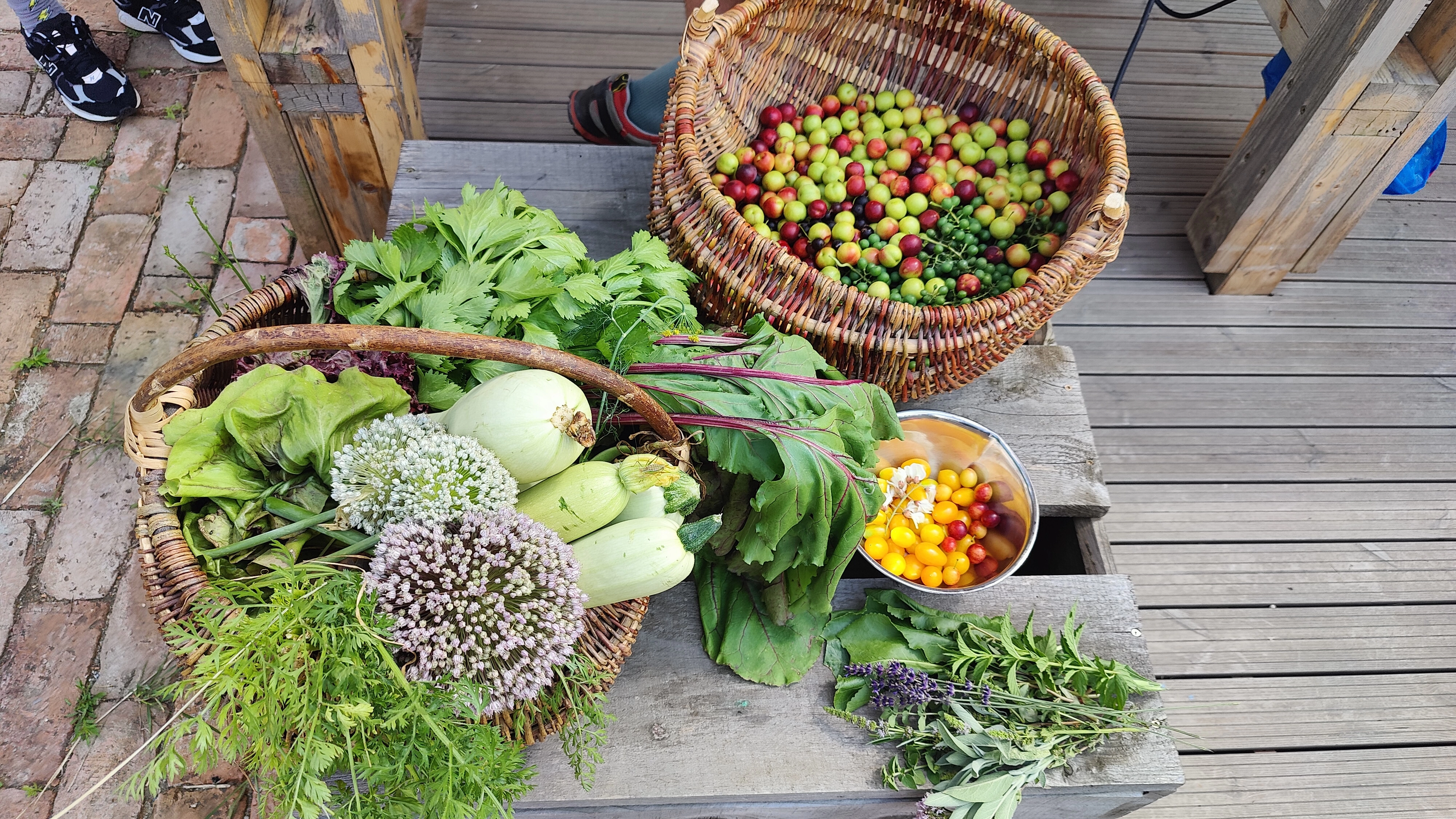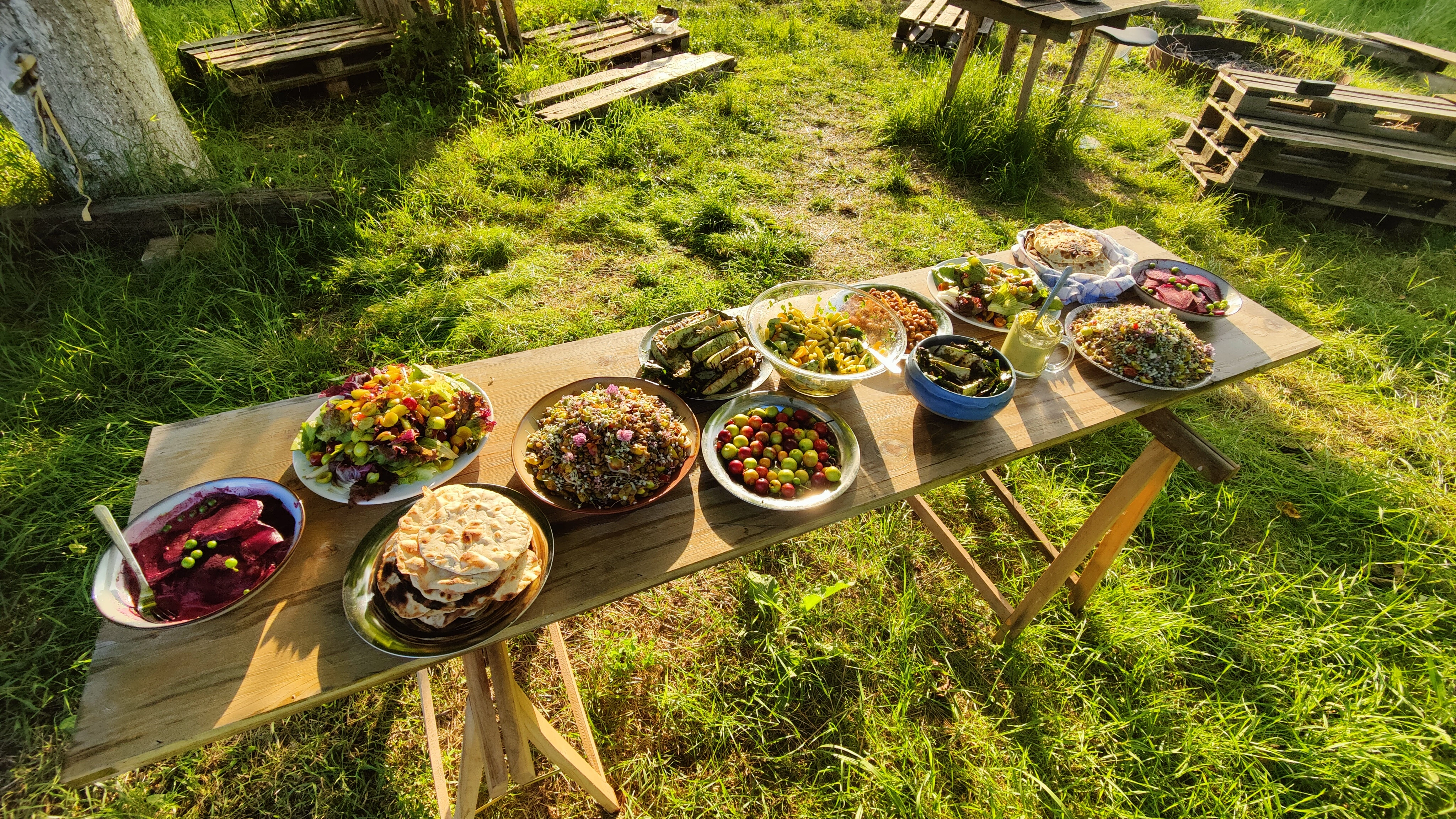 După discuție, tinerii s-au apucat să gătească împreună, conform indicațiilor lui Noemi Hügel, a cărei preocupare este să facă mâncare vegană ușor accesibilă, pentru oameni care nu au avut niciodată legături profunde cu bucătăria. Majoritatea ingredientelor folosite au venit direct din grădina comunitară, însă câteva au fost aduse de Noemi din altă parte: năut, linte, făină. „Am venit cu idei despre cum se gătește cu floră spontană și legume, fiind fluidă în decizii.(...) M-am gândit și la activități care ar putea fi distractive – făcutul de lipii. Dacă ai un pic de know-how, lucrurile se pot face ușor, mai ales dacă lași loc de improvizație. Nu te bloca în limitări, cum ar fi cea a spațiului și încerci să te bazezi pe cât face fiecare: curățat corcodușe, tăiat sfecla”, spune Noemi. Am gătit împreună salată de linte cu corcodușe verzi și flori de ceapă, iarbă grasă, mentă de baltă, struguri verzi, dovlecei, sfeclă; pesto din iarbă grasp, cimbru, ceapă verde, frunze de hrean; salată de linte și de sfeclă roșie; dressing de pesto și frunze de hrean; salată verde cu morcovi arși; salată de păstăi. După o zi întreagă în arșiță, de explorat grădina și gătit, ne-am delectat, dacă e să ne luăm după reacția uneia dintre participante, cu o masă parcă făcută de zâne”.