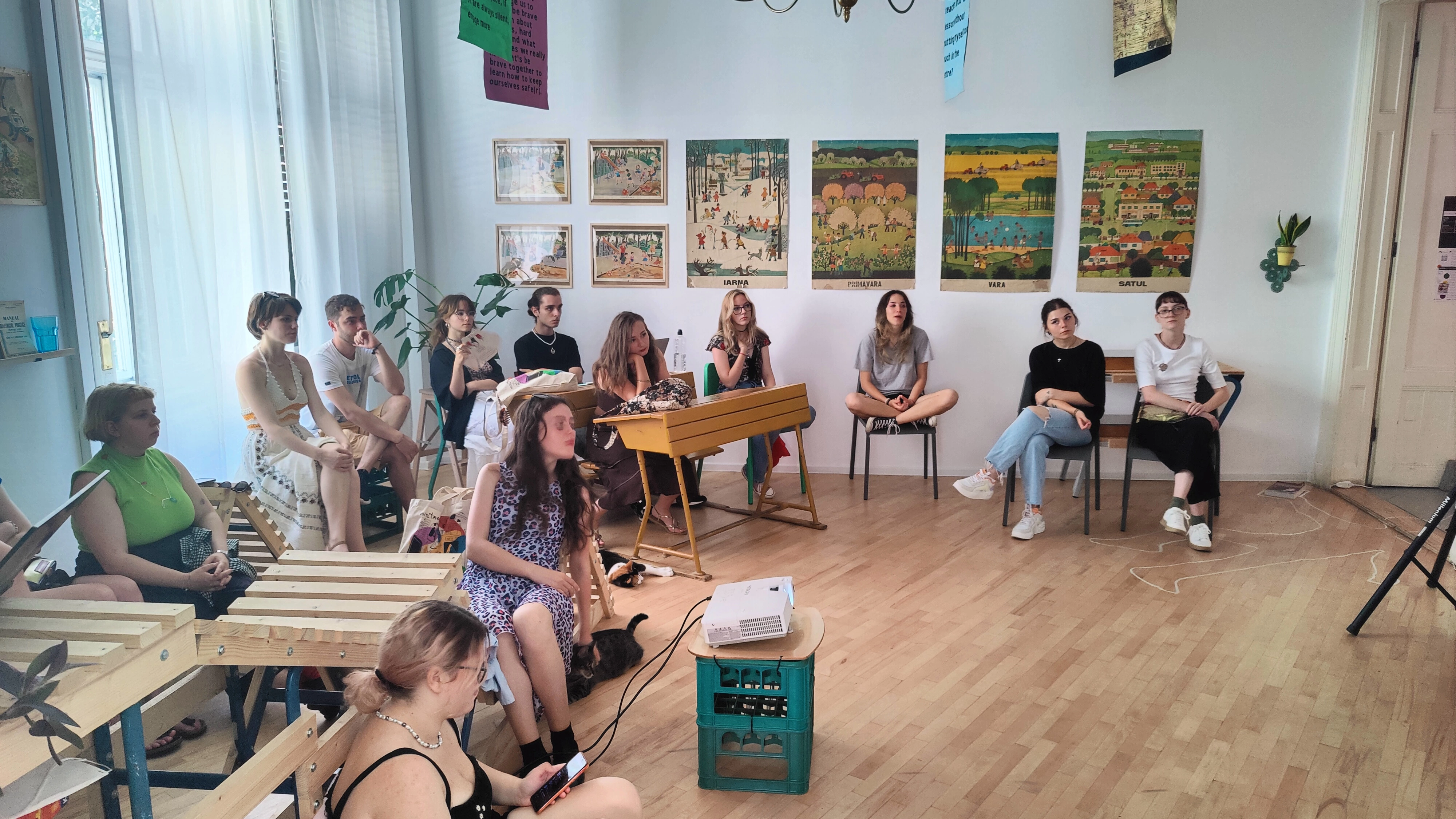 Artista Delia Popa a continuat temele naturii și performativității în cel mai eclectic dintre atelierele taberei, preocupat înainte de orice de plăcerea rezultată din energia de grup. Un prim exercițiu în spațiul Minitremu din Piața Libertății a fost lectura colectivă din cartea Donnei Haraway Staying with the Trouble, un posibil prim contact pentru tineri cu literatura feministă. Fragmentele citite vorbeau despre reziliență în fața catastrofei ecologice și hibridizarea dintre om și fluture. „Când lucrezi cu un grup trebuie să fii prezent și să simți atât grupul (energia, dinamica), cât și spațiul (cum să te legi de el, cum să-l ocupi), pentru a păstra o energie înaltă, în care toți să se simtă safe, să împărtășească lucruri”, spune Delia.
