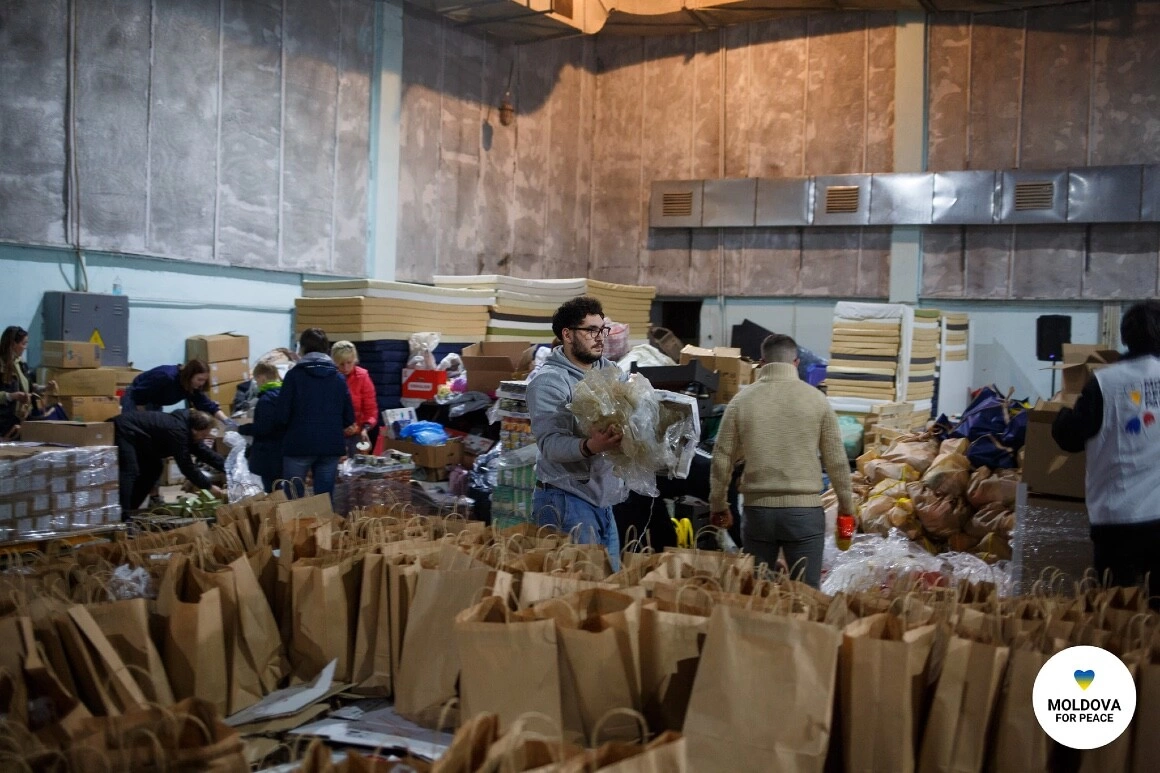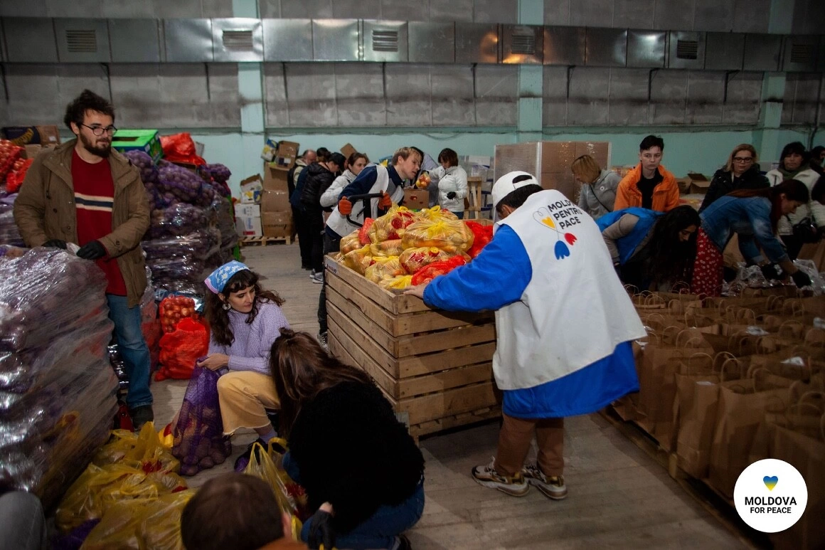E aprilie. Sunt în curtea studioului Moldova Film din Chișinău pentru a da o mână de ajutor la crearea pachetelor cu alimente pentru refugiați. La intrare, mi se dă un cod QR ca să mă înregistrez. Apoi merg în interior, unde s-au format câteva echipe: cei care pun legume în plase, cei care pun conserve sau grâne în pungi și cei care se deplasează cu aceste pungi pe cerc, trecând prin fiecare punct cu produse, până e pachetul de ajutor plin. Constanța Dohotaru, una dintre coordonatoarele inițiativei Moldova pentru Pace, mă cheamă să ajut o doamnă care pune zahăr și pastă de tomate în plase. O cheamă Vaselina, e născută în Republica Moldova, dar a plecat în Ucraina, la Mikolaiv, după facultate, unde a trăit timp de 50 de ani, până a izbucnit războiul. Împlinește 72 de ani în două zile. E aici cu fiica și nepoata. Stau în casa unei rude plecate în Italia. E prima dată la „clacă”. „Mi-a zis fiica mea, hai, mama, să oferim și noi ceva, pe lângă cât am primit”, îmi spune. Cam jumătate dintre voluntarii pe care îi cunosc aici sunt ucraineni. Câteva femei, cu mișcări sigure, s-au și angajat la depozit cu normă întreagă. Majoritatea însă vin, la fel ca mine și ca Vaselina, sâmbăta, la „clacă”, cum îi spun coordonatorii.