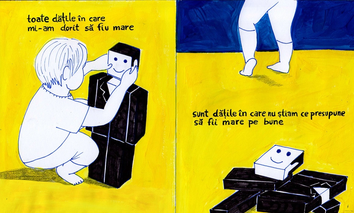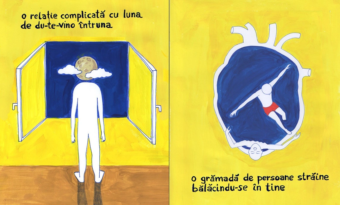Ilustratoarea Andreea Chirică a descoperit acum doi ani, la Piața de Artă și Design, Cartea cu Moace (2023, Dezarticulat) a lui Alberto Păduraru, poet și custode la Rezidența9. Răsfoind-o, cel mai mult a simțit poemul mood swings, pe care l-a desenat într-o manieră foarte personală.