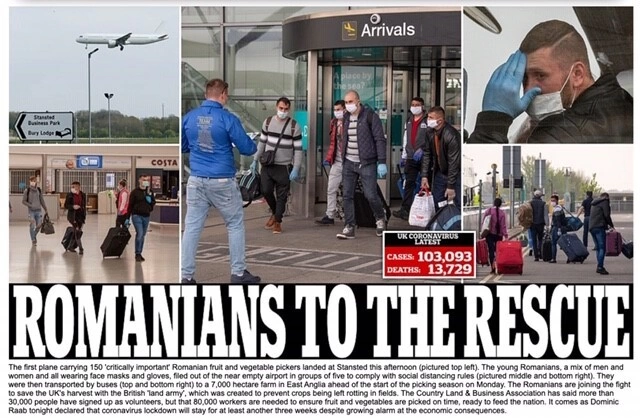 De când însă pandemia a dezechilibrat piața muncitorilor sezonieri, The Sun și The Daily Mail, publicații cunoscute pentru senzaționalismul cu care îi reprezintă pe imigranții români, des asociați cu sărăcie, găști și criminalitate, au mai renunțat la ofense. Românii sunt acum numiți brave Romanians, critical workers („curajoșii români”, „muncitori cheie”) în articole cu titluri ca Romanians to the Rescue („Românii vin să ne salveze”). Florina Tudose de la Centrul de resurse pentru muncitori est-europeni din Marea Britanie confirmă că discursul mediatic s-a schimbat la 180 de grade. „Dar o să se schimbe imediat înapoi după ce se termină toată nebunia asta, pentru că muncitorii imigranți sunt țapii ispășitori pentru problemele acestei țări de ani de zile. Am văzut o creștere în hate crime (infracțiuni motivate de ură) odată cu referendumul, dar după pandemie, când va urma o criză economică majoră, mă aștept la un val de ură și mai mare împotriva imigranților est-europeni”, continuă Florina.