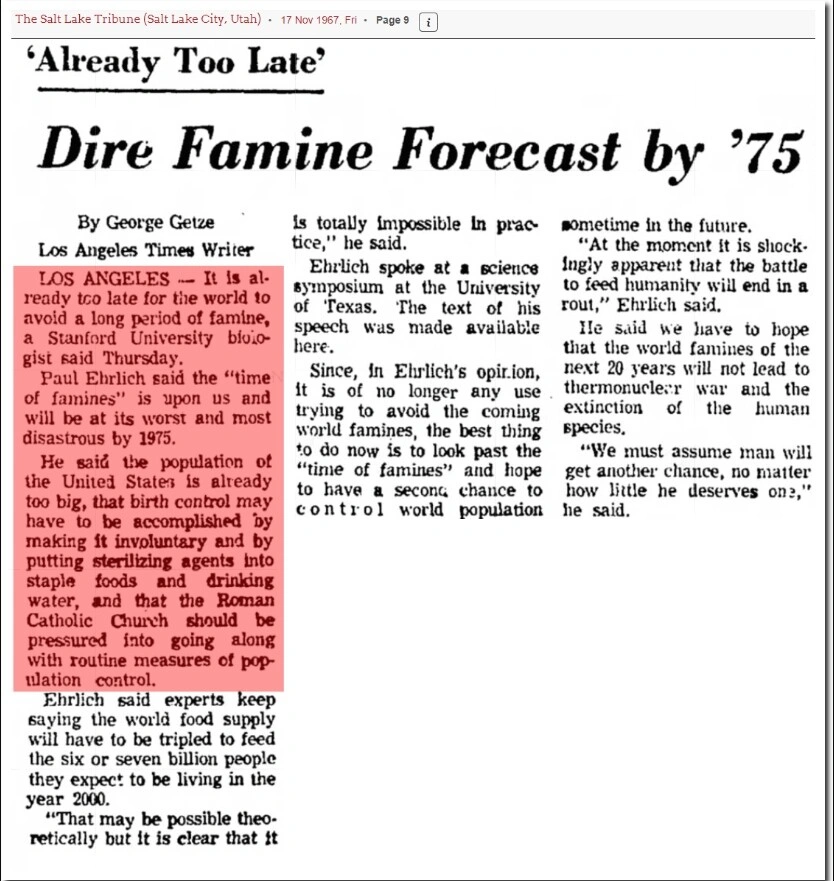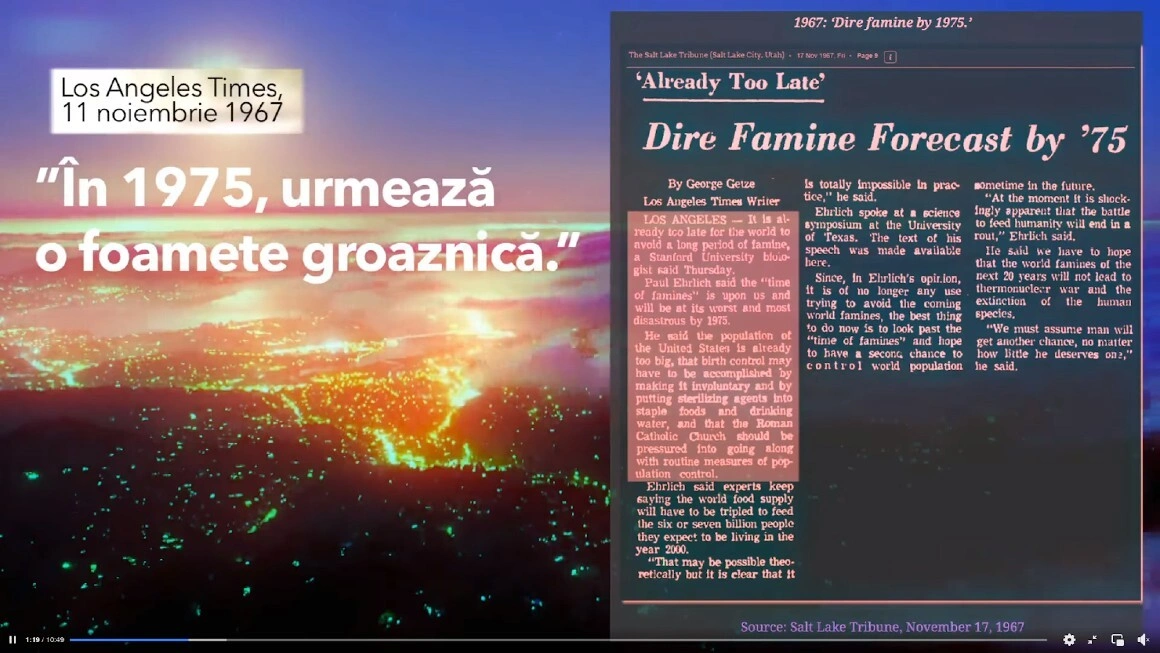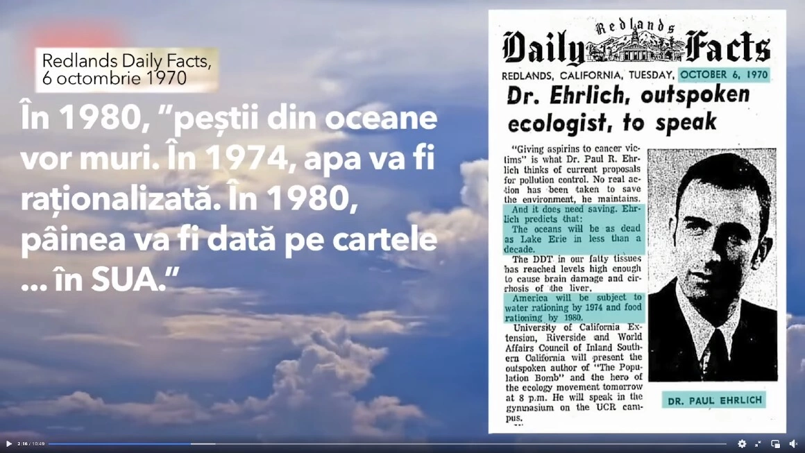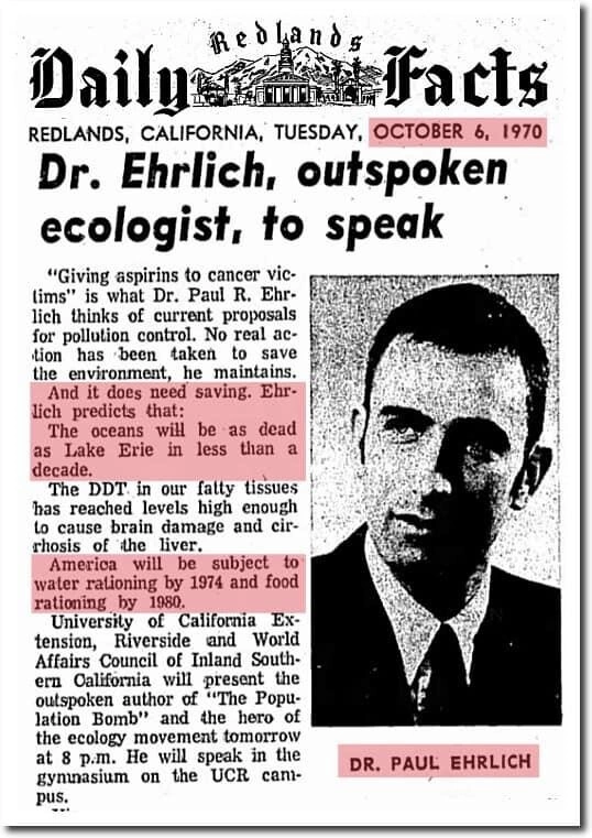 Primul exemplu se referă la biologul Paul Ehrlich, autor al cărții Bomba populației, care la sfârșitul anilor ‘60, avertiza că modelul de consum și creștere a populației este nesustenabil și că ne va duce la foamete. Cum foametea nu a venit, am putea da crezare ideii că, iată, experții nu știu mare lucru, ci vor doar să ne sperie. Însă există o nuanță ignorată — Ehrlich spusese „dacă nu se schimbă nimic”, ori în anii ‘60 s-a produs „Revoluția Verde”, o serie de descoperiri în agricultură care au crescut în mod semnificativ producția.