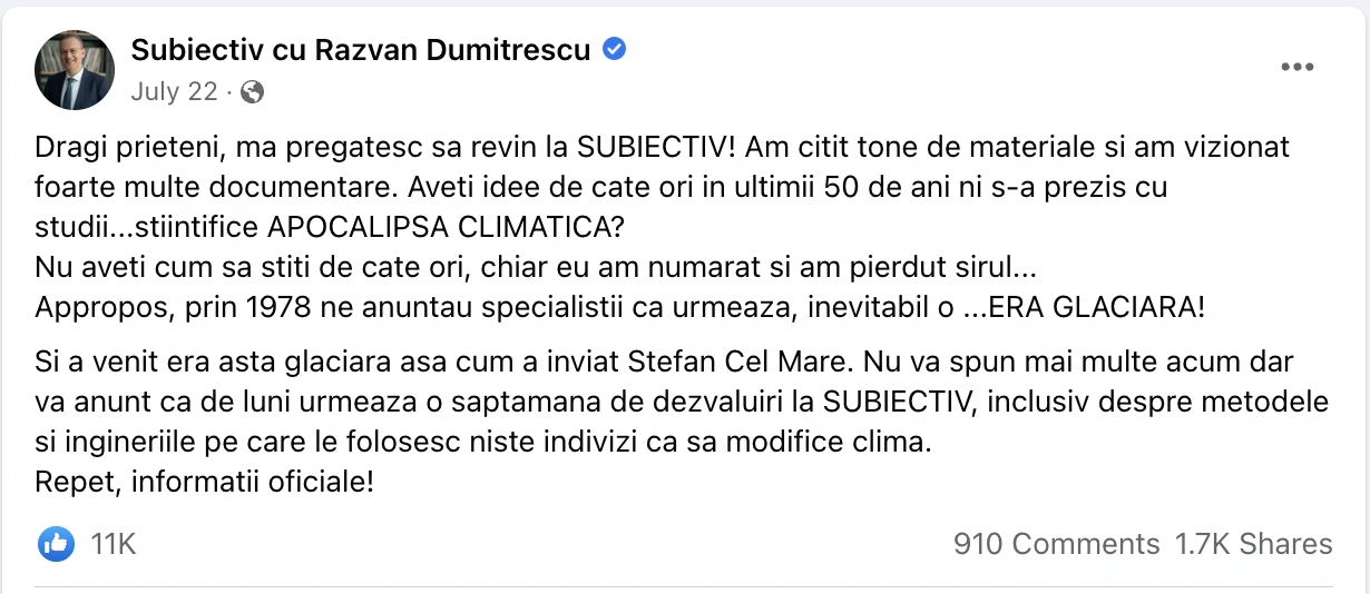 Unul dintre cei mai activi promotori ai dezinformărilor despre climă este moderatorul TV Răzvan Dumitrescu, realizator al emisiunii Subiectiv de la Antena 3 și colaborator al site-ului de știri DC News.