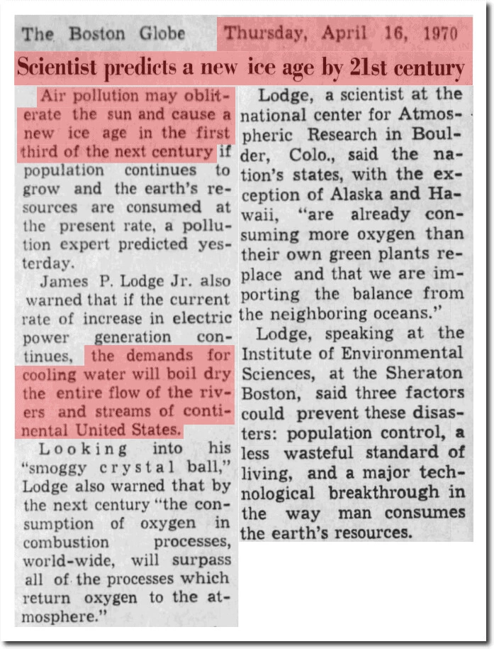 Tot din anii ‘70, ni se arată predicții pentru o nouă eră glaciară, care nu a mai venit, un mit care circulă de ceva timp în cercurile negaționiste. Mitul pornește de la o serie de studii care arătau că dioxidul de sulf emis în atmosferă generează aerosoli ce dispersează lumina solară, producând răcire atmosferică. Un studiu din 1971 arăta că o creștere de patru ori a concentrației de dioxid de sulf din atmosferă ar genera o scădere de temperatură echivalentă unei glaciațiuni. Doar că volumul de dioxid de sulf emis a fost limitat prin Legea pentru aer curat, scăzând vertiginos. În plus, spre deosebire de dioxidul de carbon, care rămâne în atmosferă până la 1000 de ani, aerosolii generați de dioxidul de sulf rezistă doar 1-2 ani. De altfel, din totalitatea studiilor publicate în perioada 1965-1979, doar 10% susțineau posibilitatea unei noi glaciațiuni, departe de „consensul științific” pe care îl pretind acum negaționiștii.