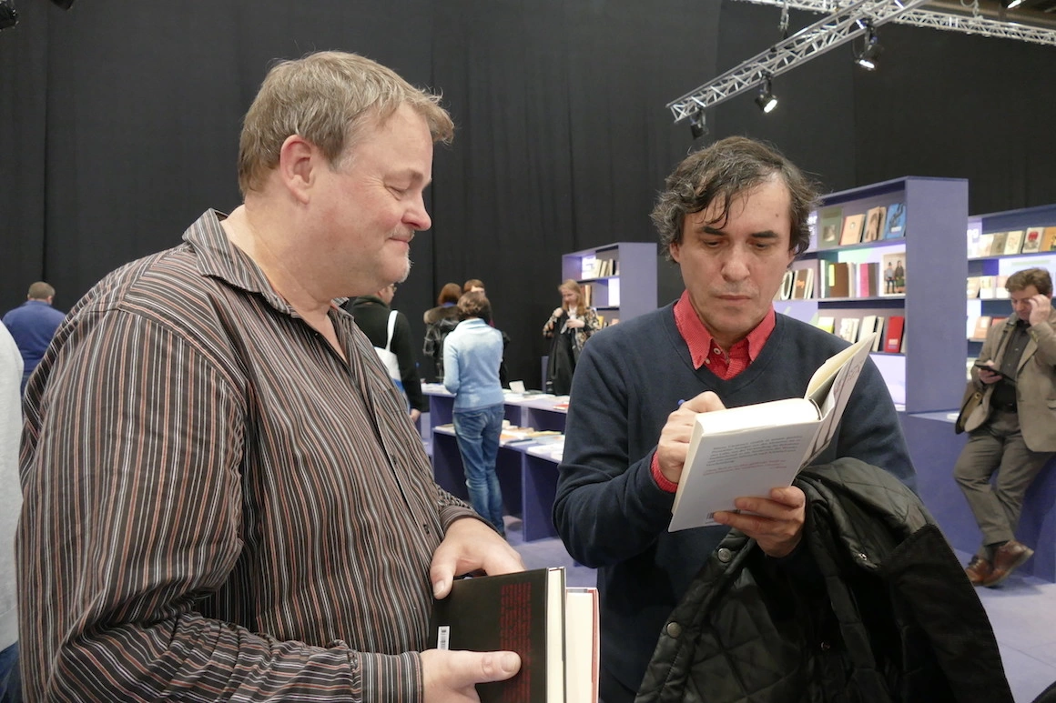 În timpul discuției, lumea se mai împrăștie, dar germanii rămân la stand. Unii merg direct la Libris și își cumpără cărți. „Cel mai bine se vând autorii invitați pe scenă, în traduceri și chiar și-n original”, spune librarul. „E abia prima zi, dar uite ce important e să te vadă lumea”.
