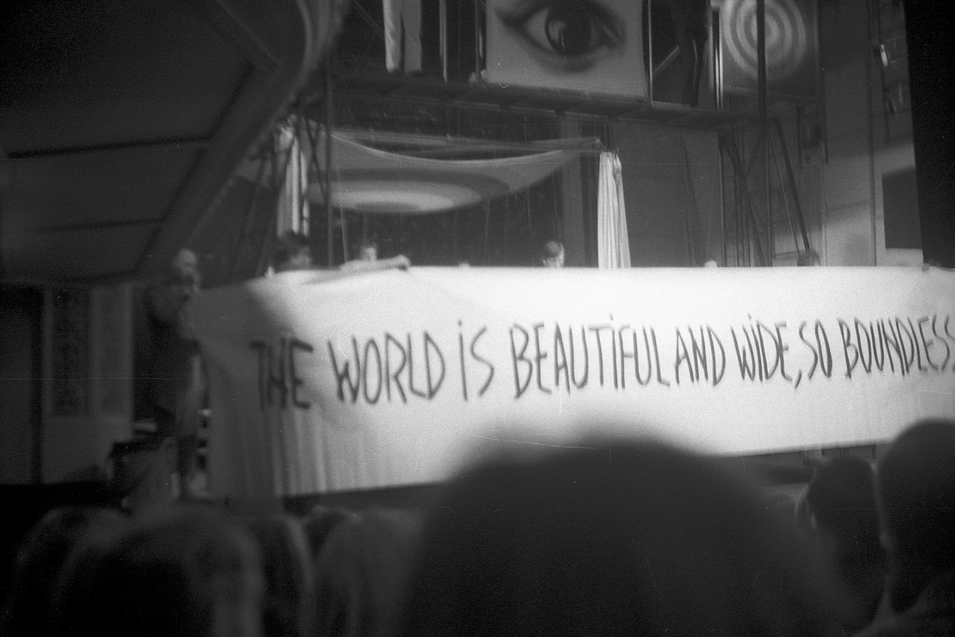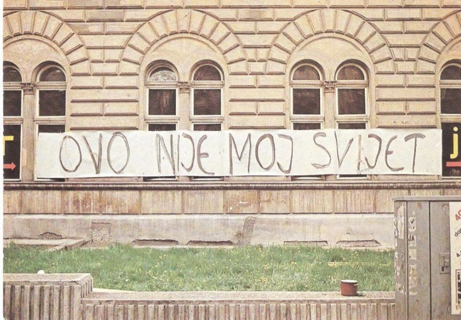 Frapant e însă mesajul pe care alege să îl transmită în timpul spectacolului, probabil un text relevant pentru piesa de teatru. Apropo de eradicarea oricărui conținut politic al acestei „delegații de artiști români” trimiși să reprezinte țara în străinătate, mi-a venit în minte ca punct de comparație o lucrare a unui artist croat din aceeași epocă. Este vorba de Željko Jerman, care în 1976 atârna pe o clădire din Belgrad un banner de mari dimensiuni pe care scrie „Aceasta nu e lumea mea”.