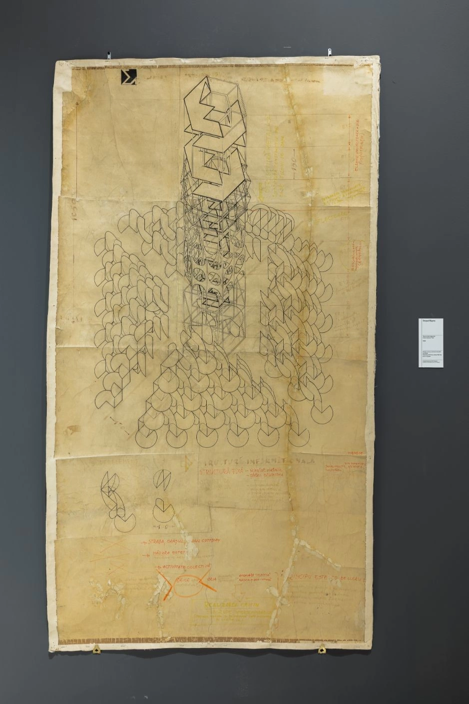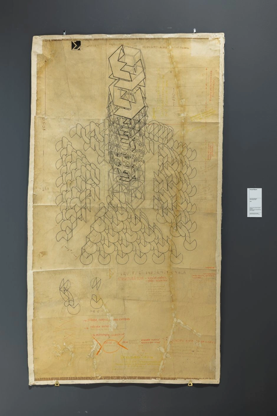 Artistul e cunoscut mai degrabă pentru desenele sale din anii 1980, în care e preocupat de apropierea de plante. În expoziție avem însă o imagine din perioada în care era asociat cu Grupul Sigma. La prima vedere, ar fi vorba de o lucrare de op-art, foarte similară cu Romboidală Invariabilă din 1968. E vorba de același tip de imagine, doar că e folosit alt material, adică nu e vorba de un panou în care au fost bătute cuie, liniile fiind traiectoriile în spațiu ale unor fire sintetice. Lucrarea de la Muzeul Național de Artă e mult mai „tăcută”, liniile desenate cu creionul fiind aproape invizibile.