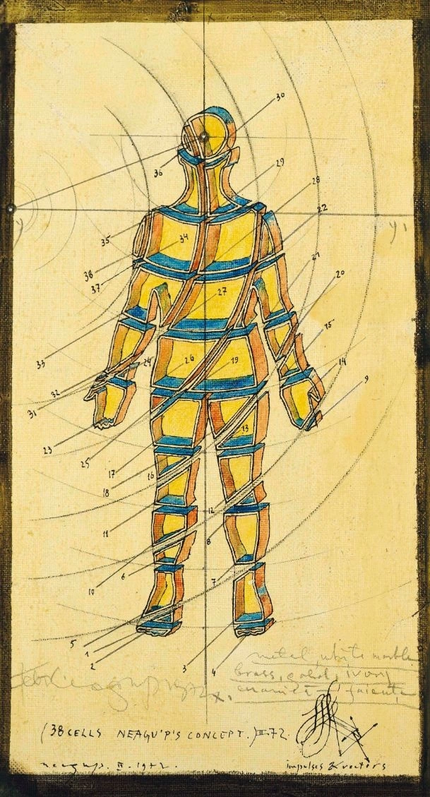 Avem aici a doua citire a obiectului, în cheia relației microcosmos-macrocosmos. Revenind la gândirea lui Bertalan, ce se adaugă aici cosmosului guvernat de matematică și fizică e chiar omul. În mod evident, această nouă piesă din inventarul lumii interacționează cu aceasta în moduri similare cu cele evidențiate deja de Bertalan. Astfel, câmpuri de forțe împart corpul uman în celule, îl secționează în părți componente, integrându-l în același timp în mediul înconjurător.