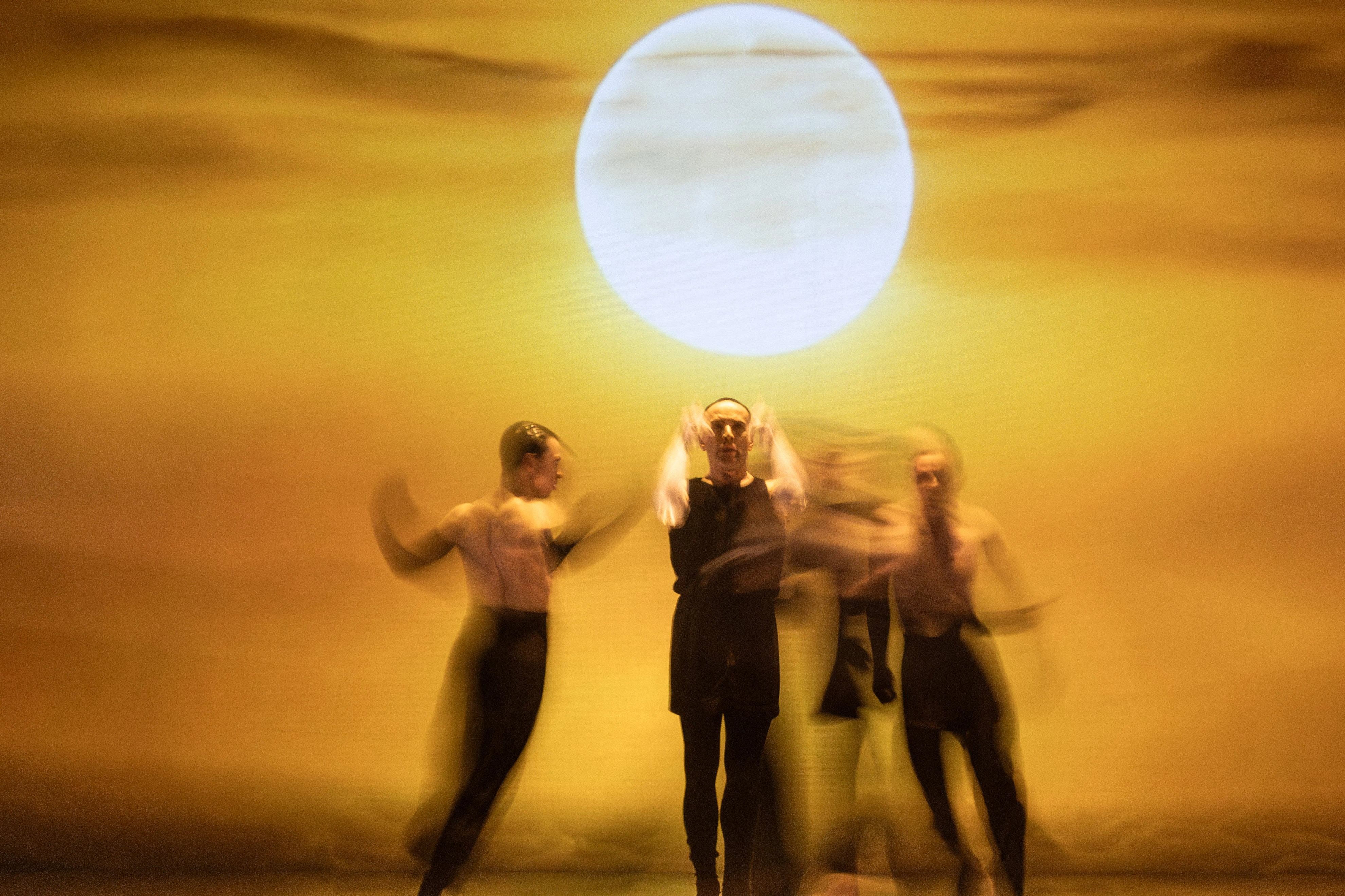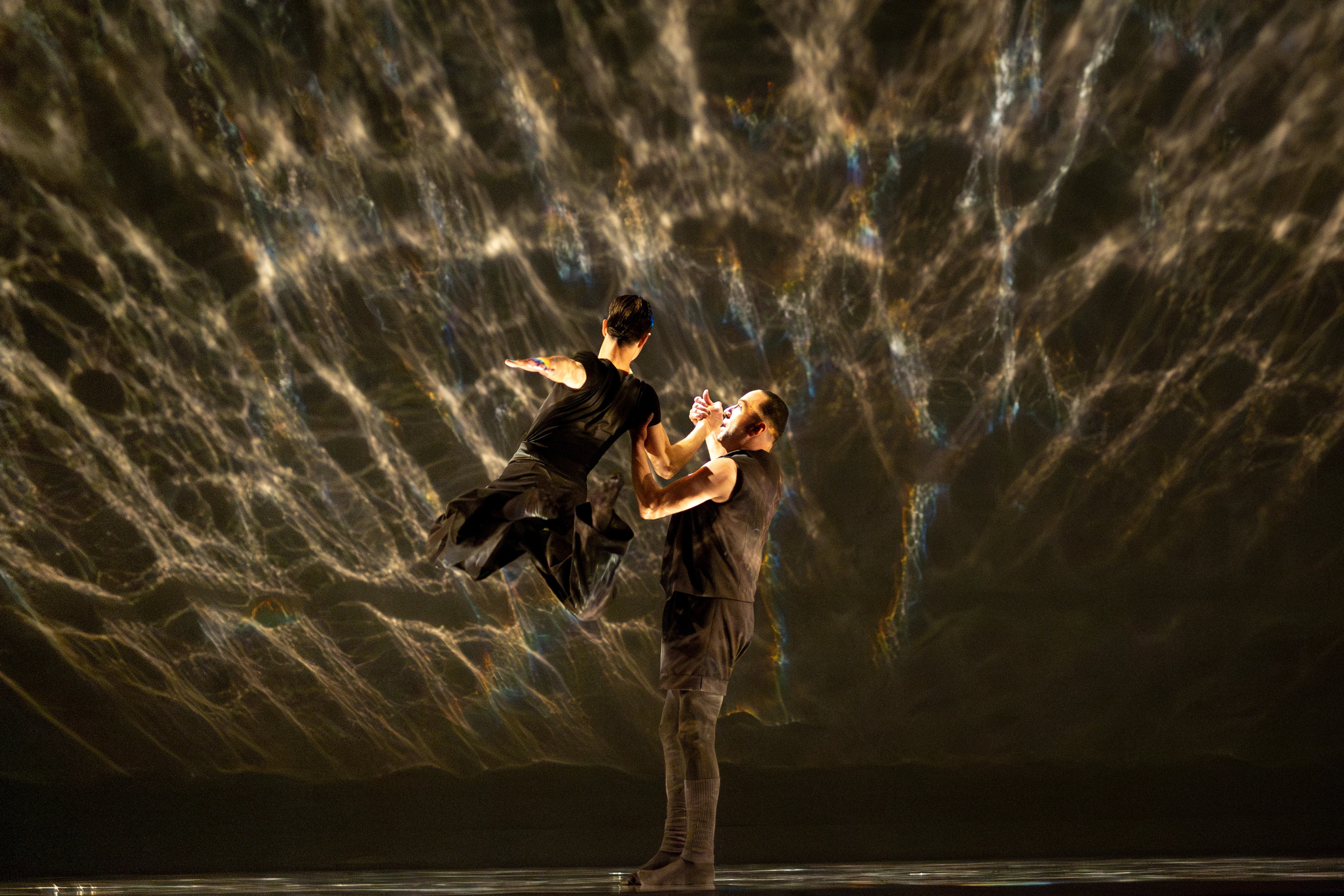 Din întunericul beznă se aude o indicație tehnică și scena e deodată inundată de lumină. Proiecția unui apus monumental se reflectă, împreună cu siluetele actorilor, în covorul-oglindă de pe podeaua scenei, care dublează imaginea într-un efect spectaculos. Performerii, care se pregătesc să repete una dintre scenele spectacolului Nijinski – agonie și extaz, pare că stau pe muchia unui lac neclintit. Coregraful Arcadie Rusu se ridică din primul rând și li se alătură pe scenă, unde le oferă explicații și corecturi.