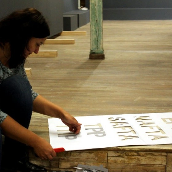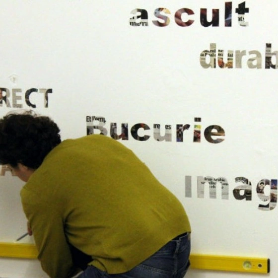 Mai sunt două zile până când Noaptea Albă a Galeriilor o să scoată sute sau mii de oameni din casă și o să-i trimită, cu harta-n mână, spre ateliere & expoziții. Într-o casă ridicată-n centrul Bucureștiului acum 126 de ani, unde Regele Mihai își primea odată musafirii la serate sau își bea tacticos ceaiul lângă sobă, câțiva muncitori lucrează de zor. Mai o vopsea colo, mai o măsurătoare dincolo – ultimele luni au lucrat la foc continuu să transforme casa de patrimoniu în spațiu de expoziție. Teancuri de pânze, markere și vopsele, pliante și cataloage stau împrăștiate pe podea. La subsol, câteva artiste acoperă pereții cu cuvinte decupate din ziare și pereții devin ei înșiși un fel de ziar; doar că din cronicile de evenimente la zi, din războaie, corupție, meciuri de fotbal, meteo și rubrici economice, iese un fel de poezie. În pod, o altă artistă decupează litere dintr-o coală de hârtie – TTIP, TTP și tot așa, înșiruiri aparent banale, dar care alcătuiesc acronimele unor tratate economice puse la punct de marii jucători ai geopoliticii.