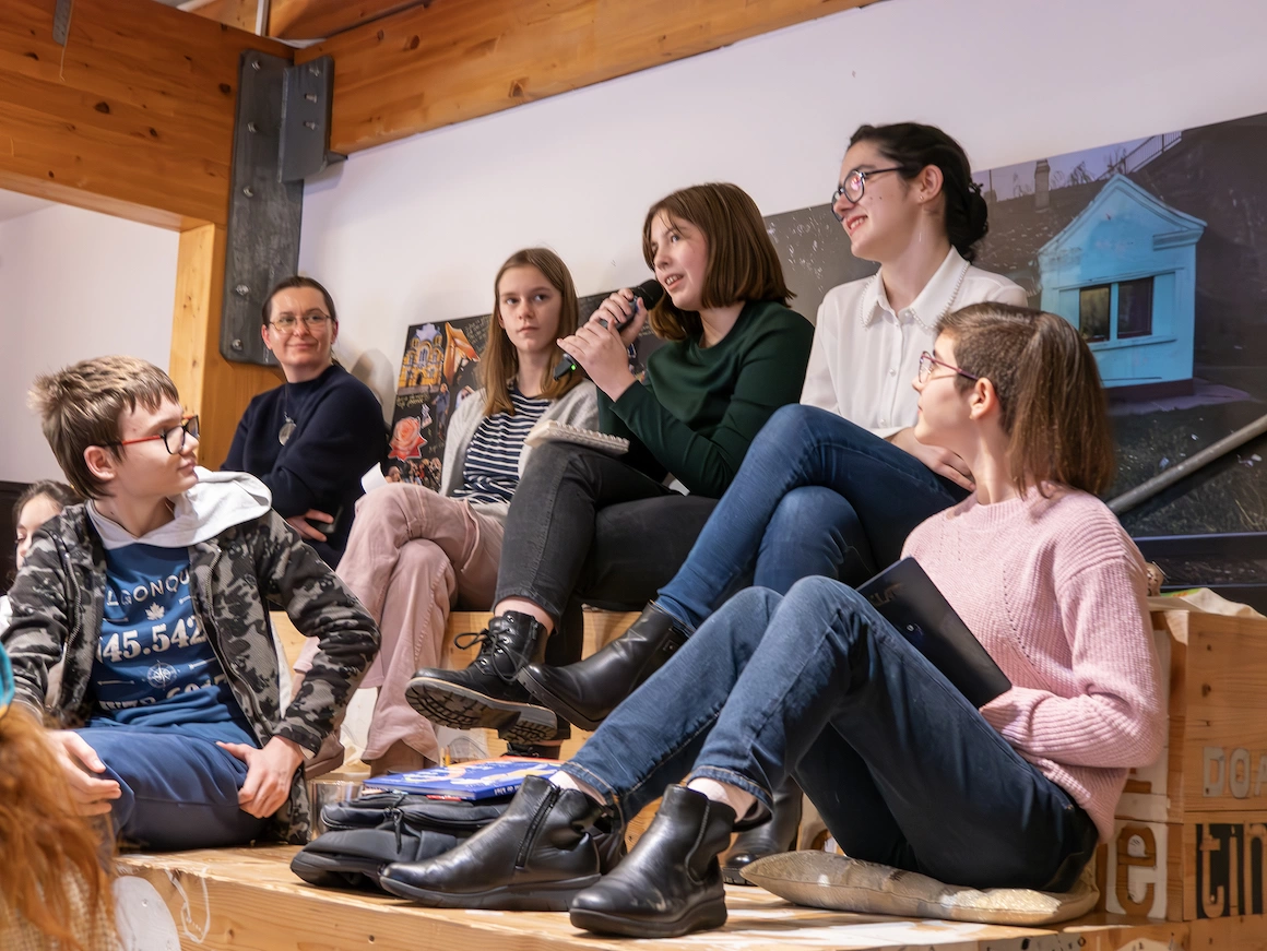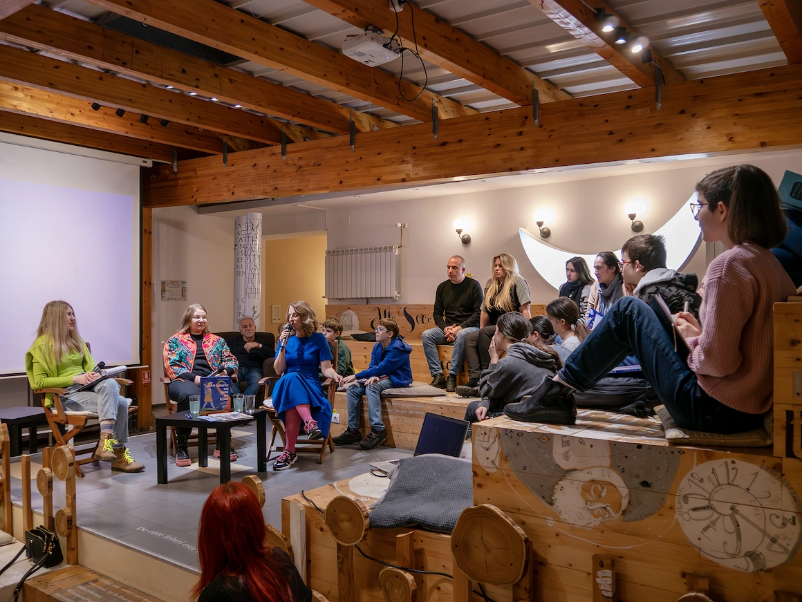 Camera începe să se umple. Are o formă mai ciudată, în mijloc fiind locul unde vorbesc invitații, în spate o jumătate de cerc ce înconjoară video-proiectorul, iar în față mese și scaune amenajate. Adina și Irina iau microfoanele și încep să povestească despre întâlnirea lor și despre procesul de scriere și ilustrare a cărții.