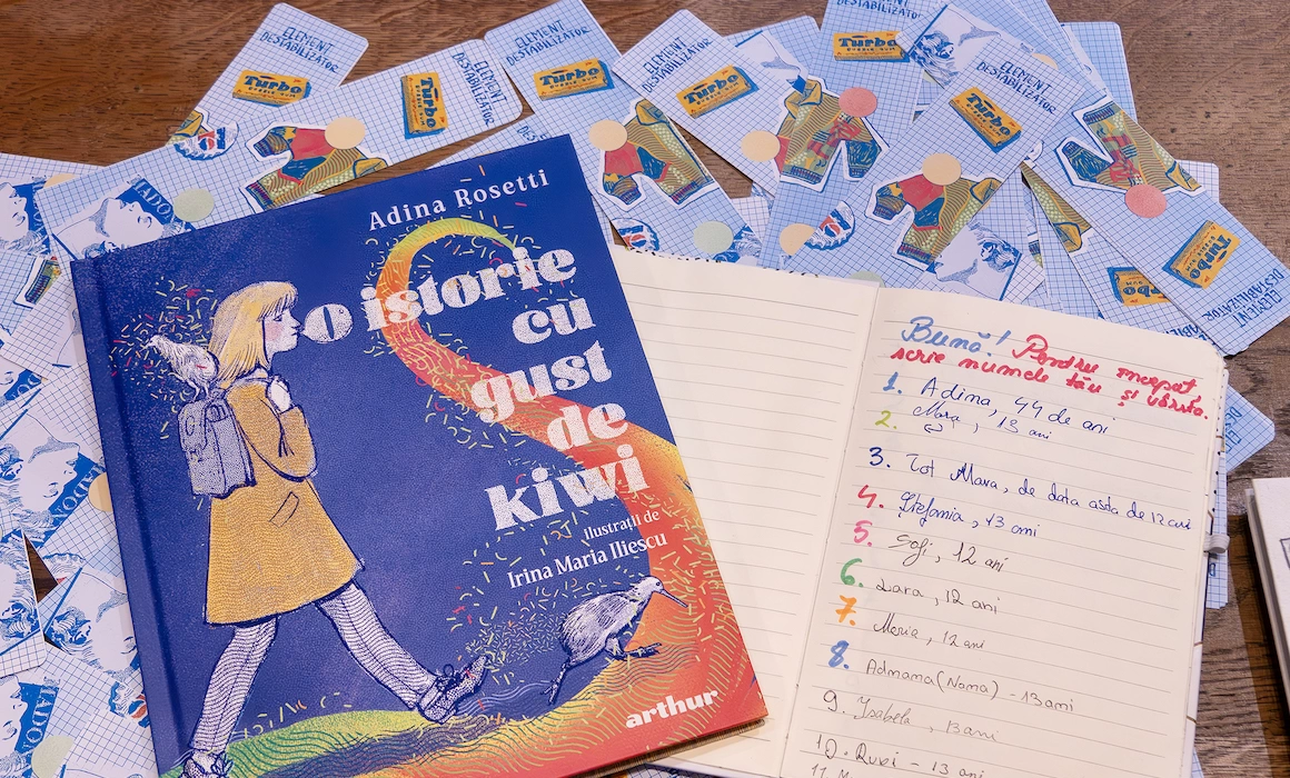 În timp ce autoarea și ilustratoarea povestesc, prin sală se dă din mână în mână un Oracol, întocmai ca cel din carte. Publicul răspunde la întrebările din el, sorbind din câte un pahar cu suc de kiwi, trăgând cu ochiul și la răspunsurile celor care au completat deja. Mai târziu, Adina citește un pasaj din carte, despre sucurile acidulate, guma Turbo și casetele audio. Îi văd pe câțiva dintre adulți zâmbind, probabil amintindu-și și ei de aceste lucruri speciale pentru perioada respectivă. Spre final, pe ecran sunt proiectate câteva poze din anii ‘90, atât cu Adina, cât și cu Irina, iar publicul este invitat să pună întrebări. La finalul serii, copiii vin cu cartea la cele două autoare pentru câte un autograf. Pare că fiecare a rămas cu o amintire plăcută la care să se gândească atunci când bea un suc de kiwi! (Maria Cioflec, 13 ani, București)