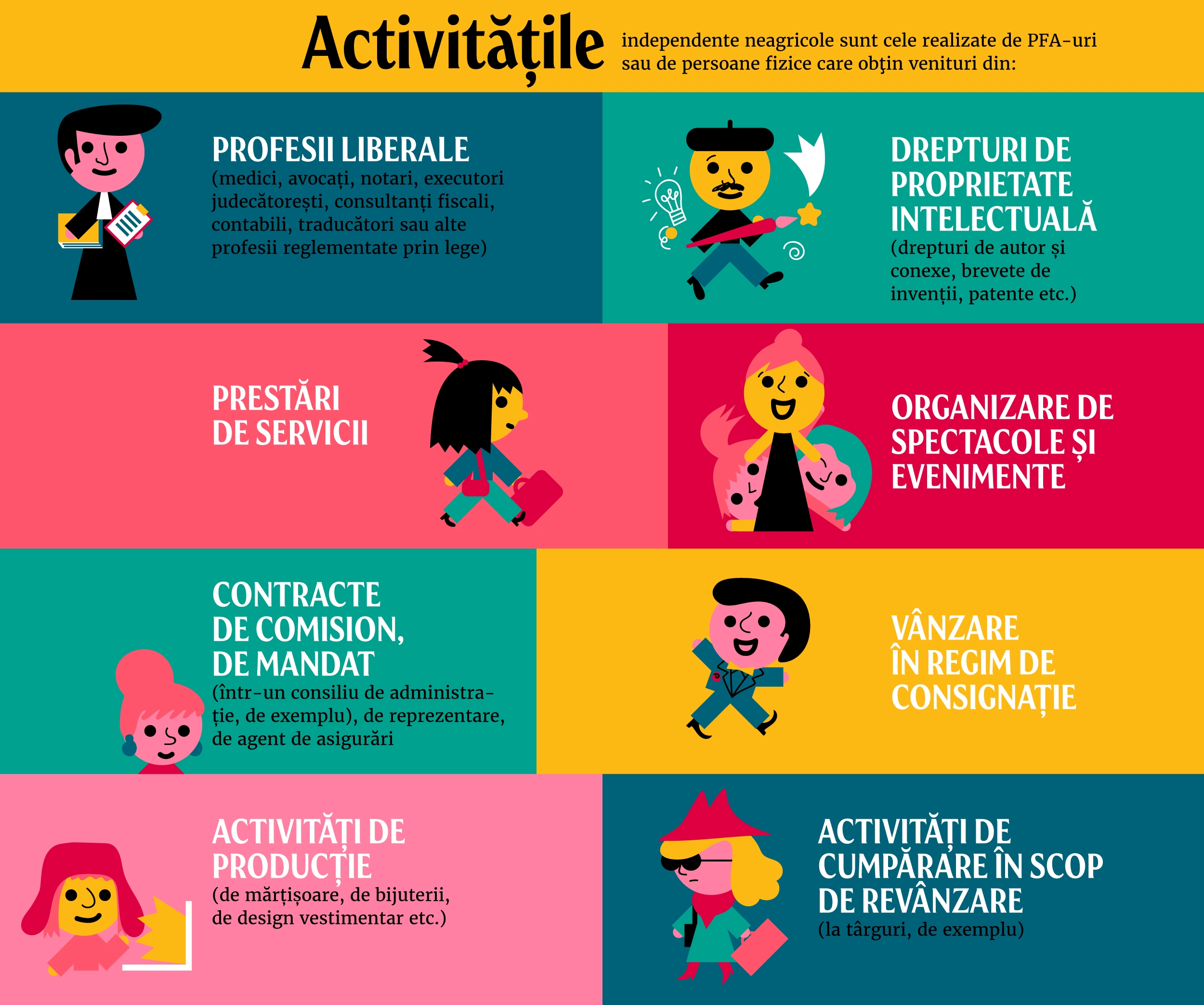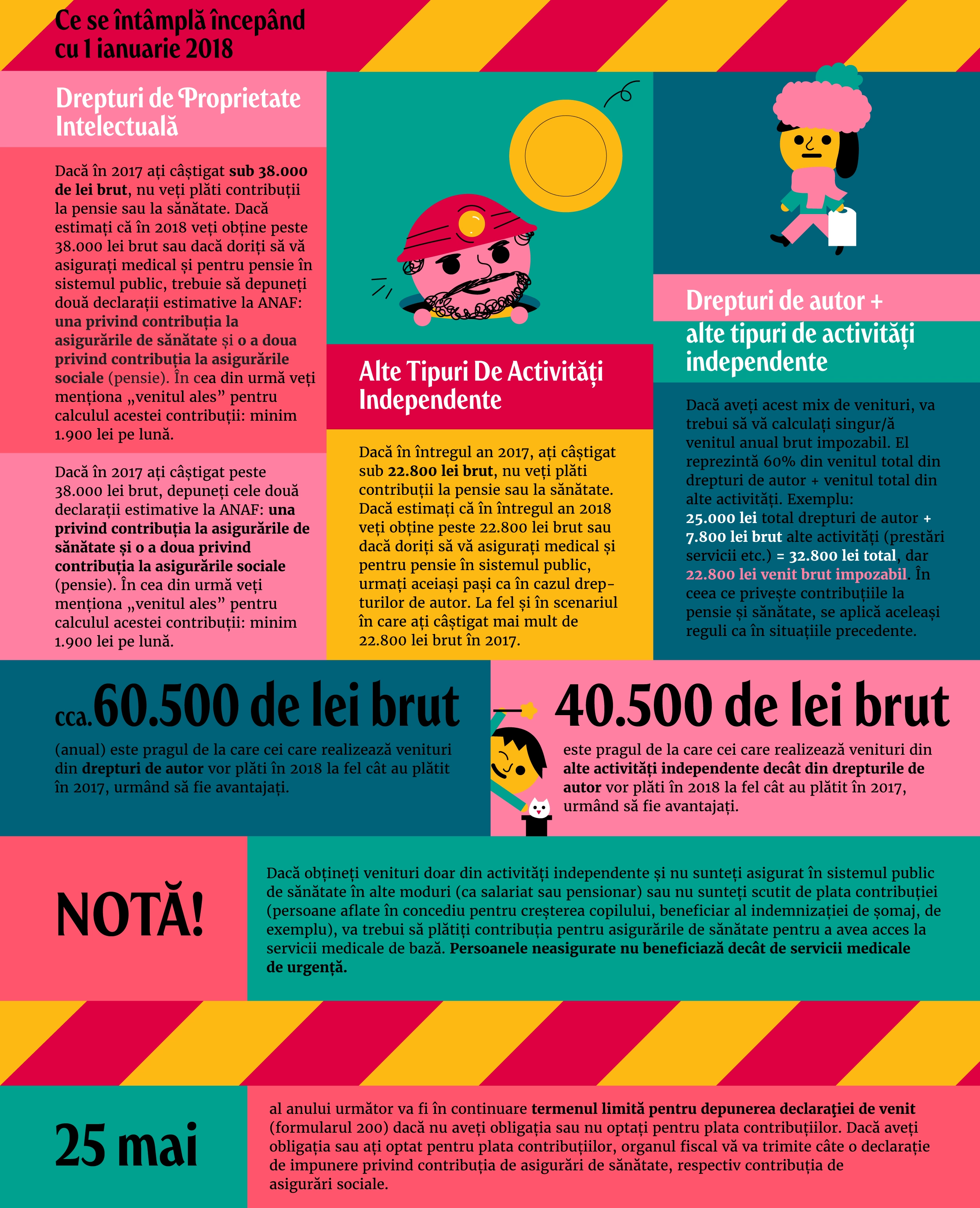 Costul muncii independente va creşte cu 20-25% în mod real, nu contabil, susțin organizatorii dezbaterii „Statul, banii și liber profesioniștii”, găzduită aseară de spațiul MACAZ - Bar Teatru Coop.. Asta pentru că, în cazul lucrătorilor independenți, nu e vorba despre niciun transfer al contribuţiilor de la angajator la angajat, cum este în cazul salariaților, ci de o pură majorare. Jurnalista Iulia Popovici, cunoscută pentru expertize și diagnoze culturale (inclusiv privind regimul fiscal al lucrătorilor culturali), a tras aici un prim semnal de alarmă în această privință, după adoptarea OUG 79/2017 pentru modificarea Codului Fiscal. Apoi a făcut calcule și-a pus date cap la cap, să vadă ce-ar urma să înfrunte, din 2018, lucrătorii independenți (care nu realizează activități agricole), printre care se numără jurnaliștii, traducătorii, actorii, regizorii sau scenografii. A adunat ce-a aflat în infograficul de mai jos, făcut de Sorina Vazelina, și a detaliat informațiile în dezbaterea de la MACAZ, alături de consultantele fiscale Ana-Maria Grecu şi Raluca Nicolae și de regizorul independent David Schwartz.