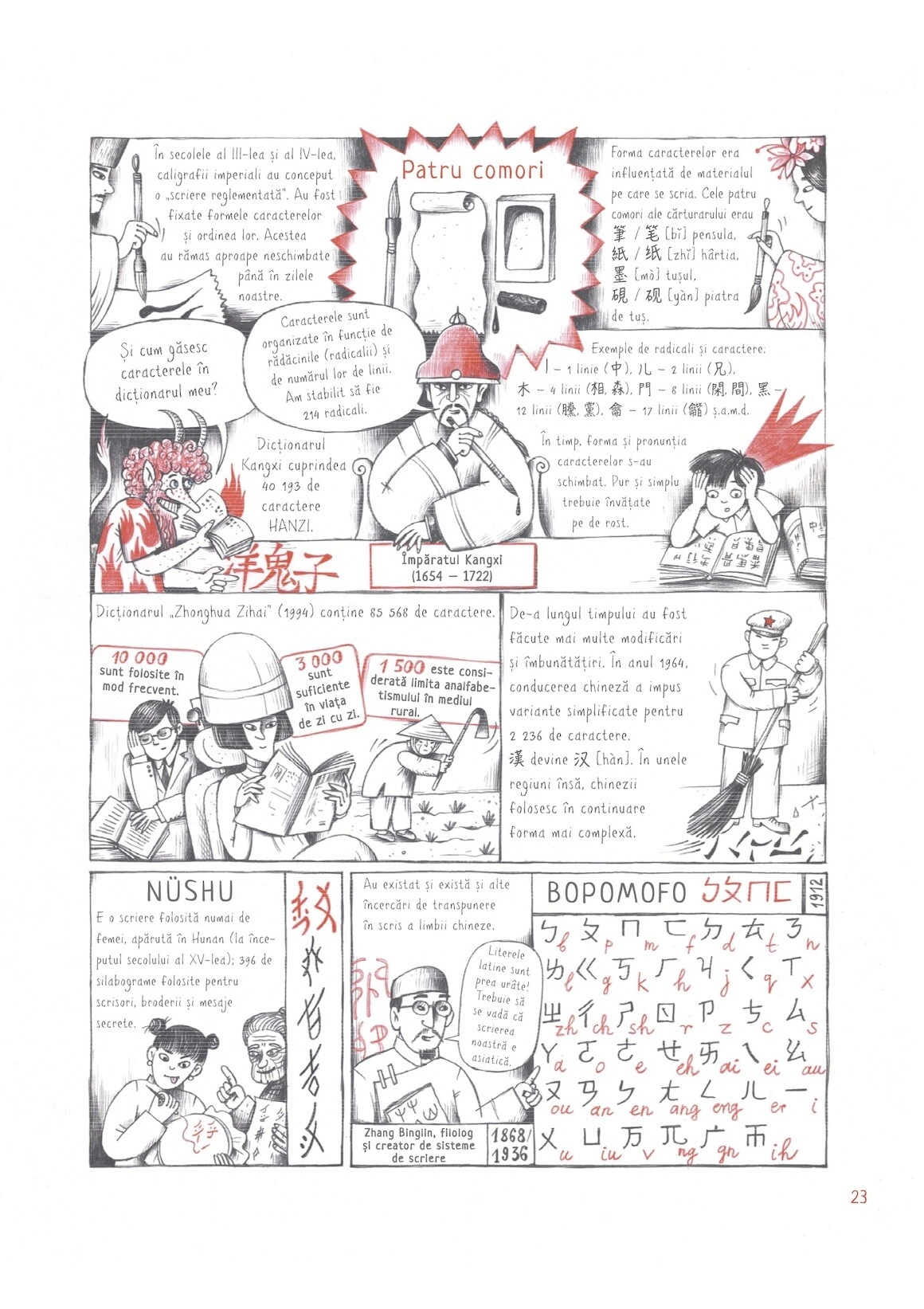 Astfel de informații afli din cartea O istorie a scrisului. De la scrierea cuneiformă la emoji, scrisă și desenată de Vitali Konstantinov, apărută în 2023 în colecția Grafic la Editura Grafic, tradusă din limba germană de Bianca Șahighian.