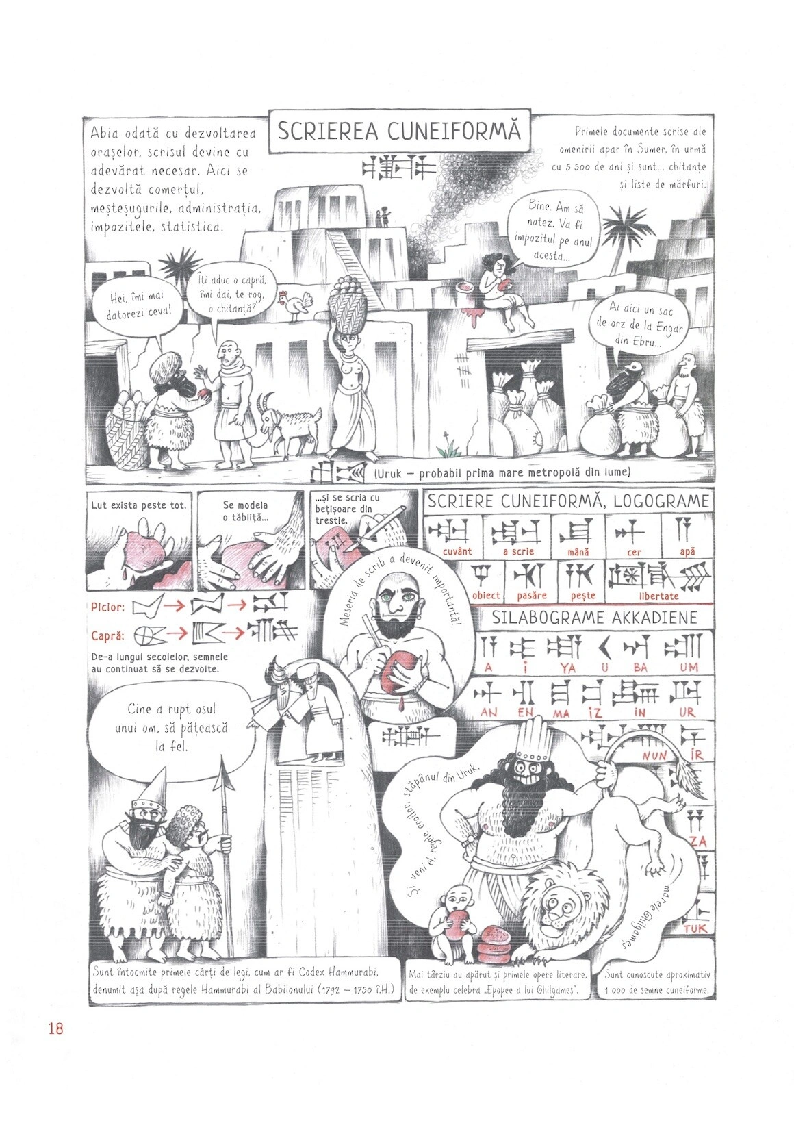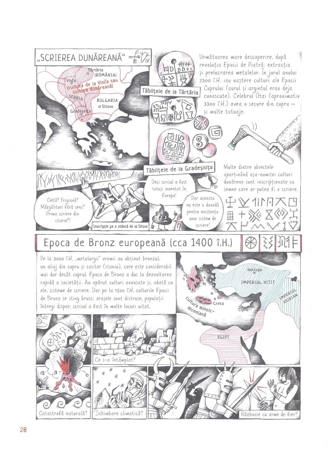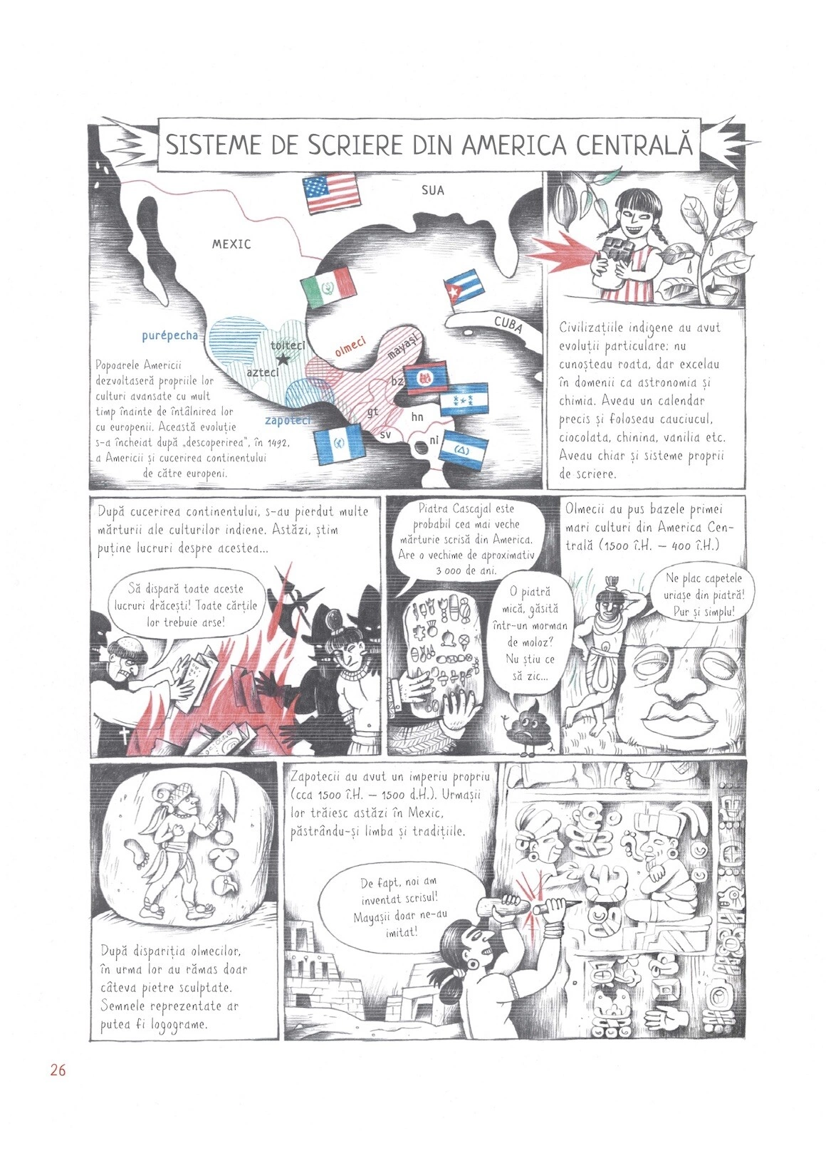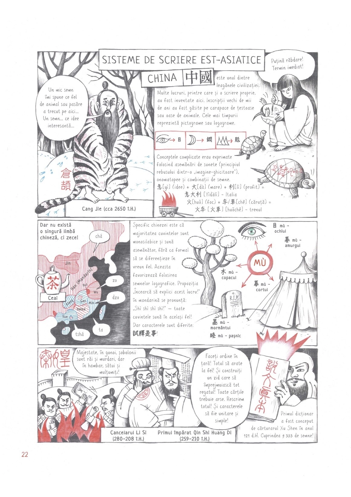 Cu umor și curiozitate, povestea te poartă prin istoria scrierii (și deci într-un fel a umanității) din Mesopotamia până în Japonia, de la mari civilizații, la triburi și populații puțin cunoscute.