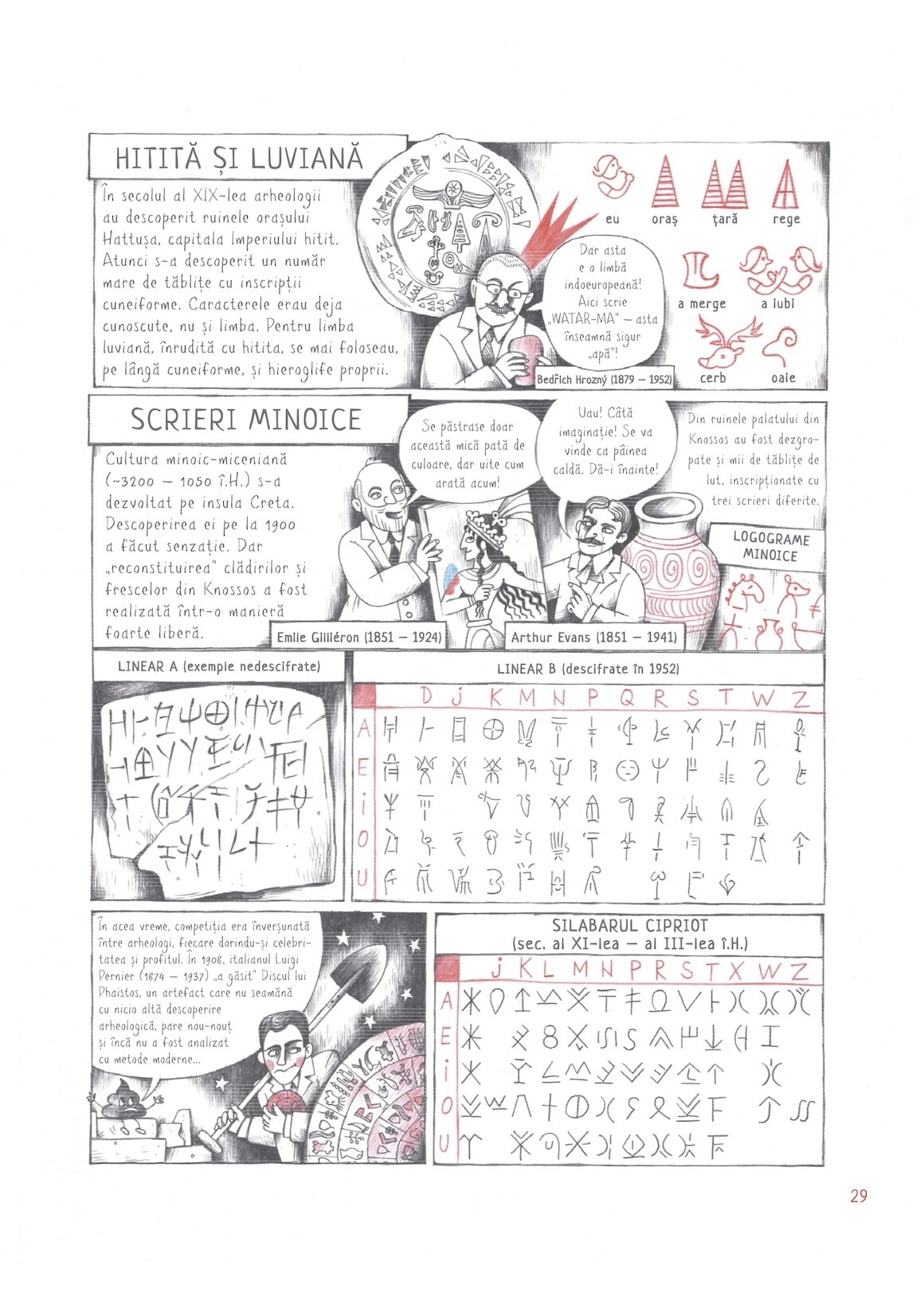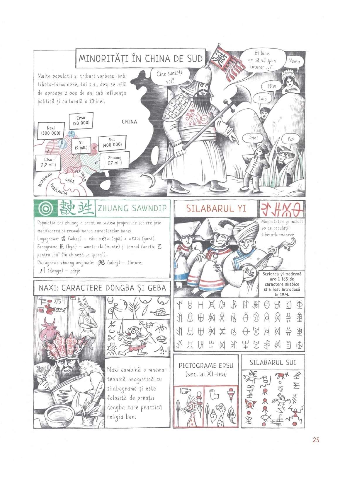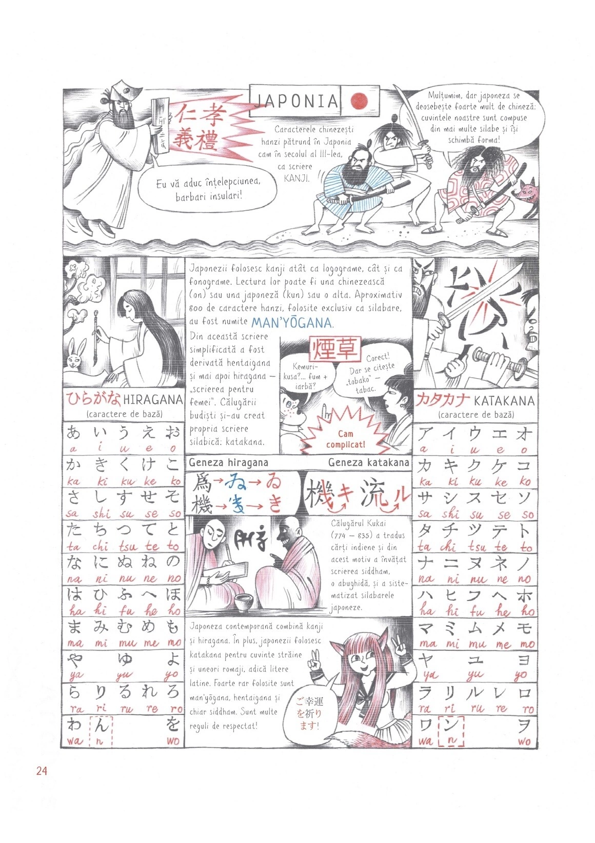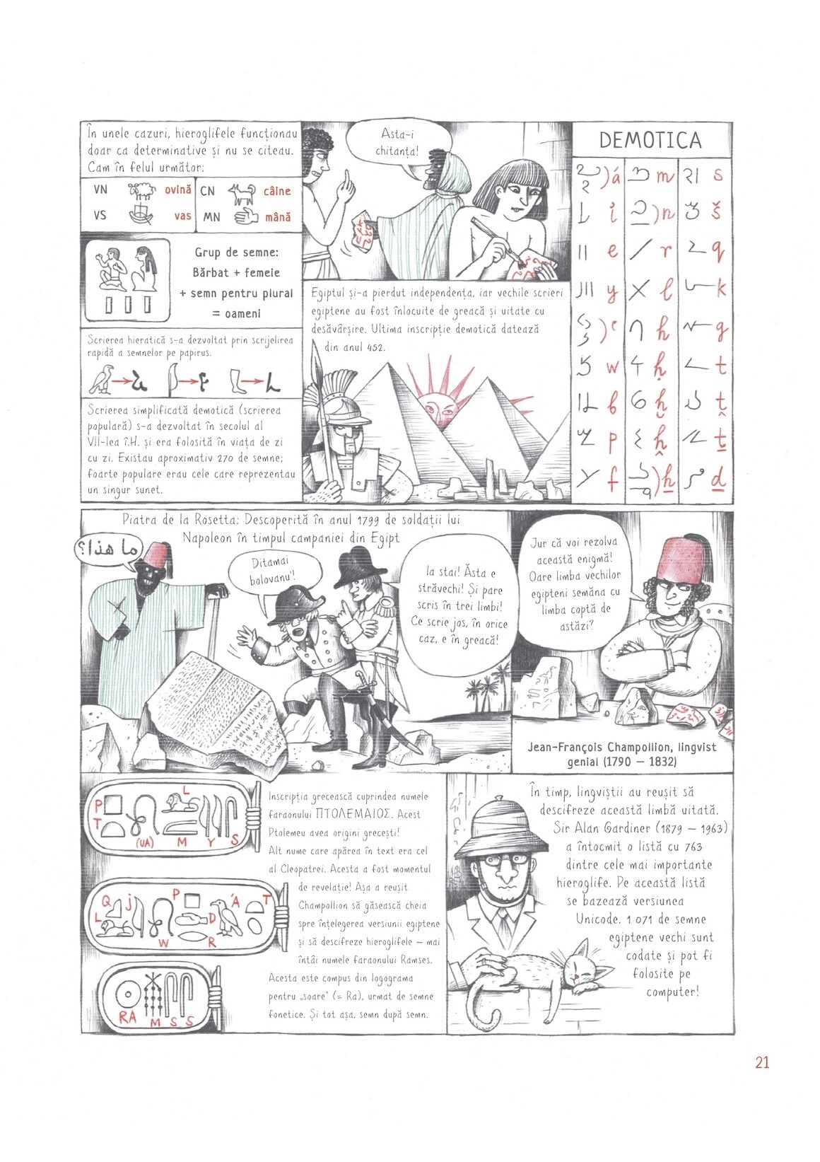Cu umor și curiozitate, povestea te poartă prin istoria scrierii (și deci într-un fel a umanității) din Mesopotamia până în Japonia, de la mari civilizații, la triburi și populații puțin cunoscute.